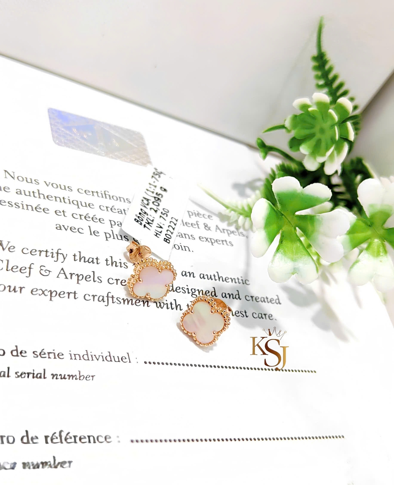 Chất liệu: Thường được chế tác từ vàng vàng 18K kết hợp với mặt khảm xà cừ (Mother-of-Pearl) ánh hồng nhạt.