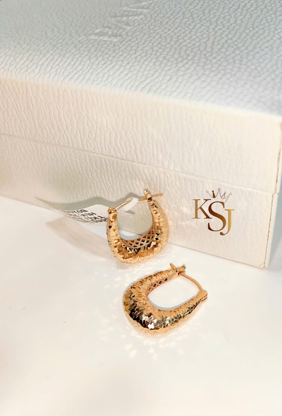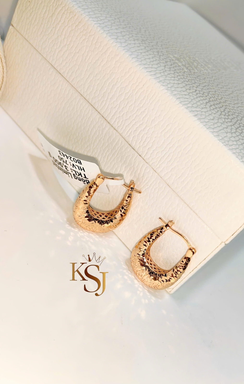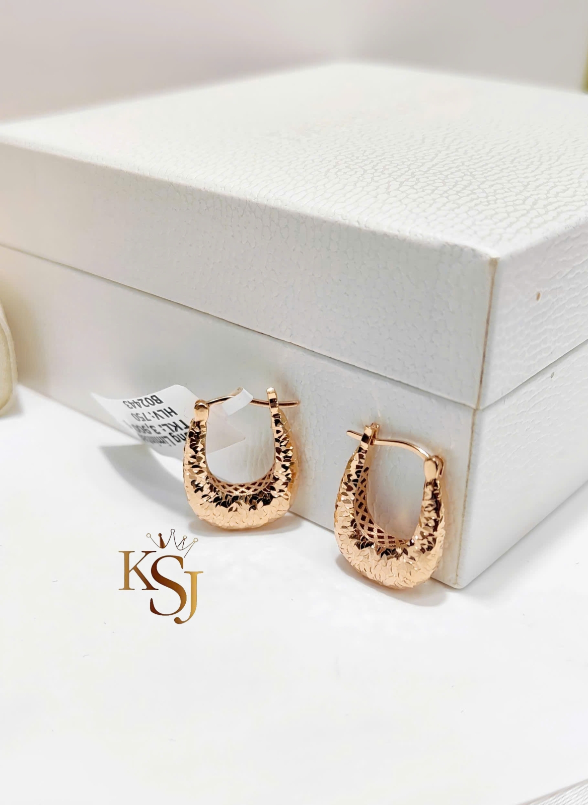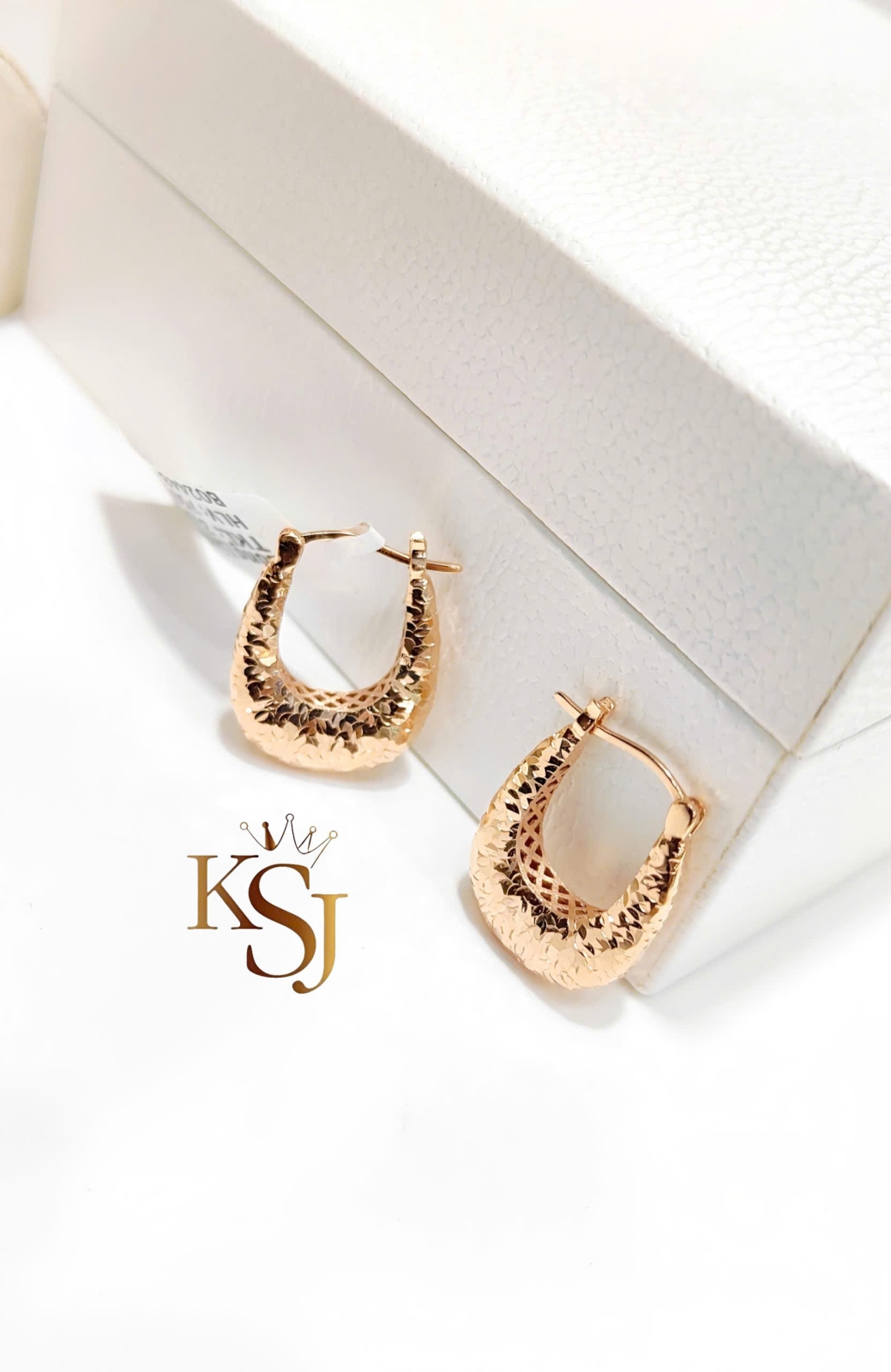 Mẫu bông tai là kiểu bông tai khoen (hoop earrings) dáng quả lê hoặc hình chữ U, được hoàn thiện với kỹ thuật cắt máy (diamond-cut) tạo bề mặt lấp lánh và có vân nổi đặc trưng