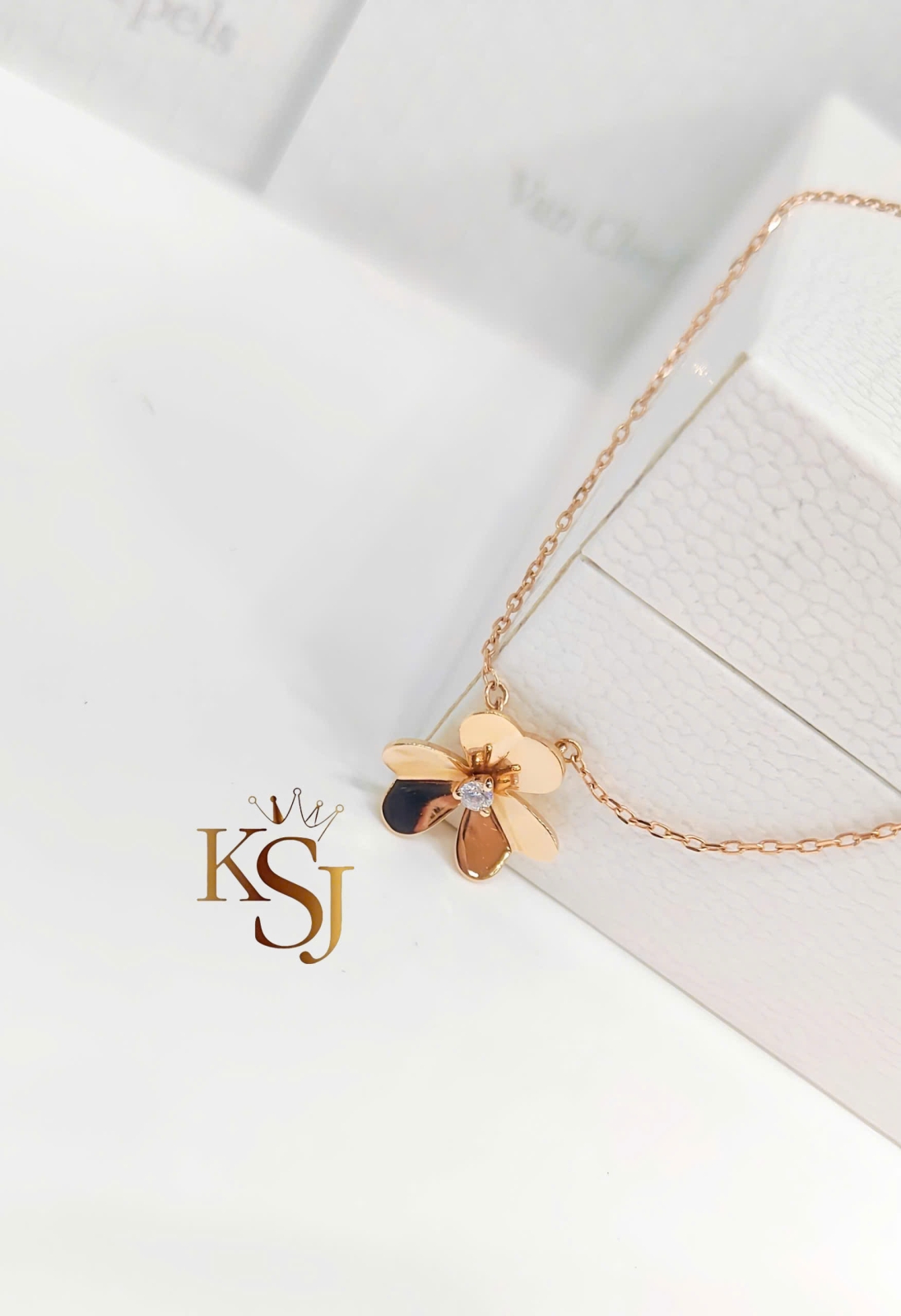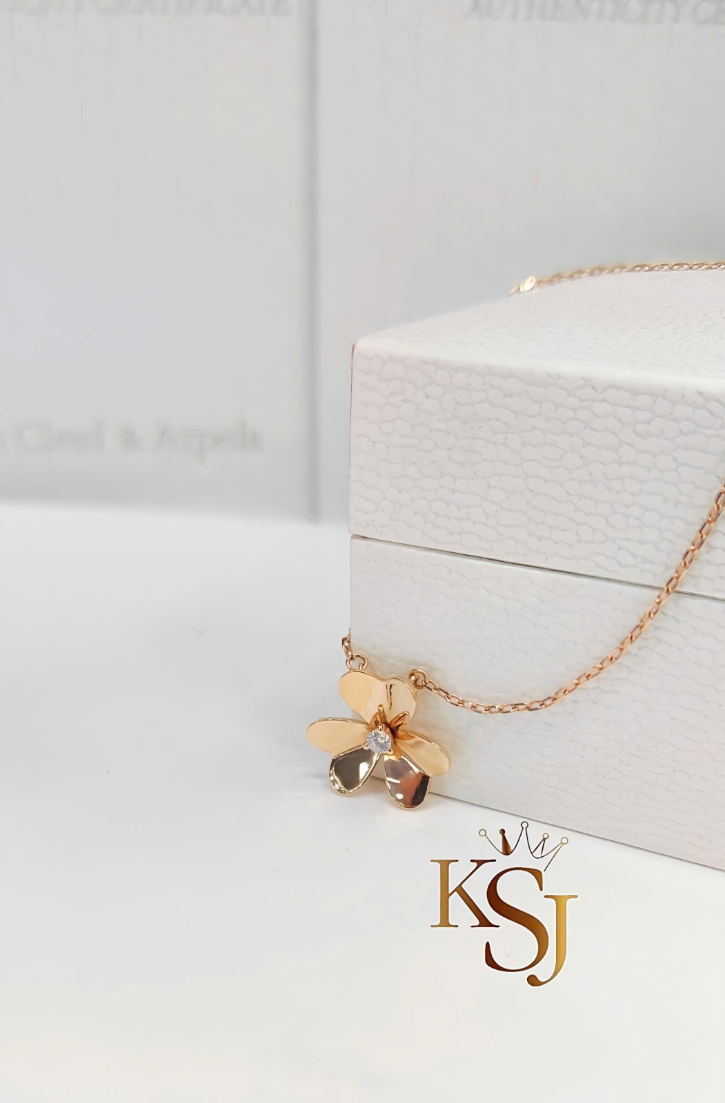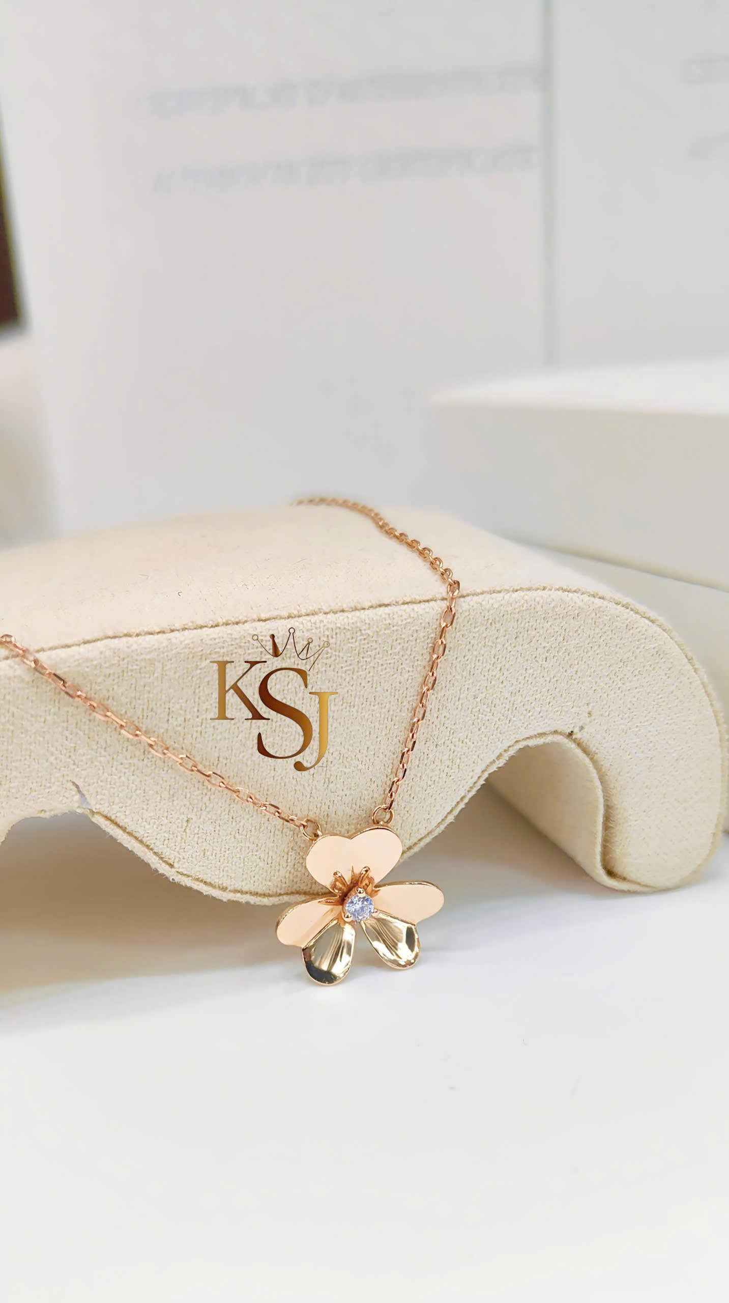Thiết kế: Mặt dây chuyền hình bông hoa với các cánh hoa hình trái tim được đánh bóng gương (mirror polish) để tạo độ phản chiếu ánh sáng tối đa.