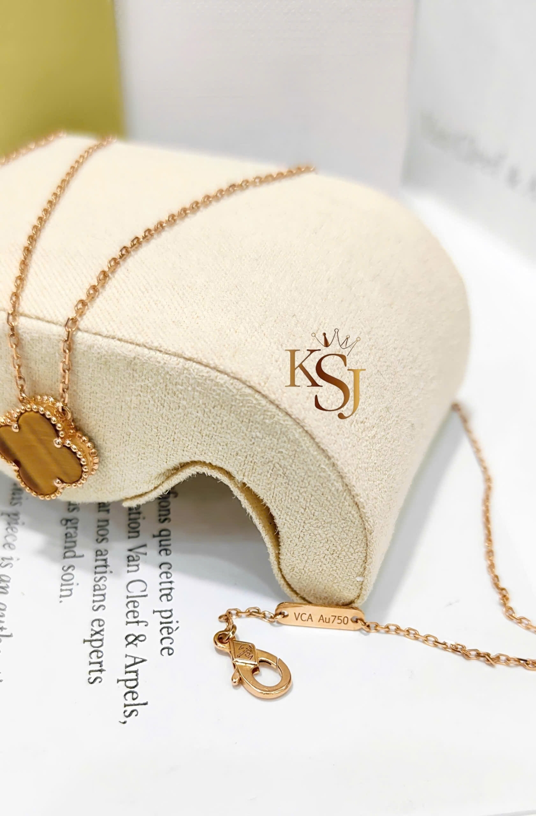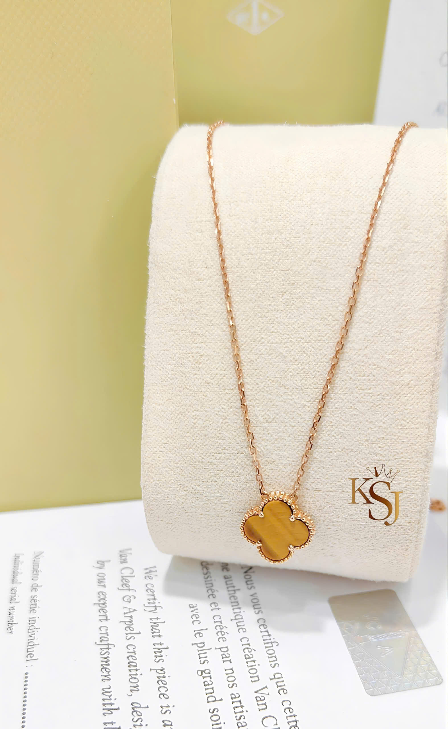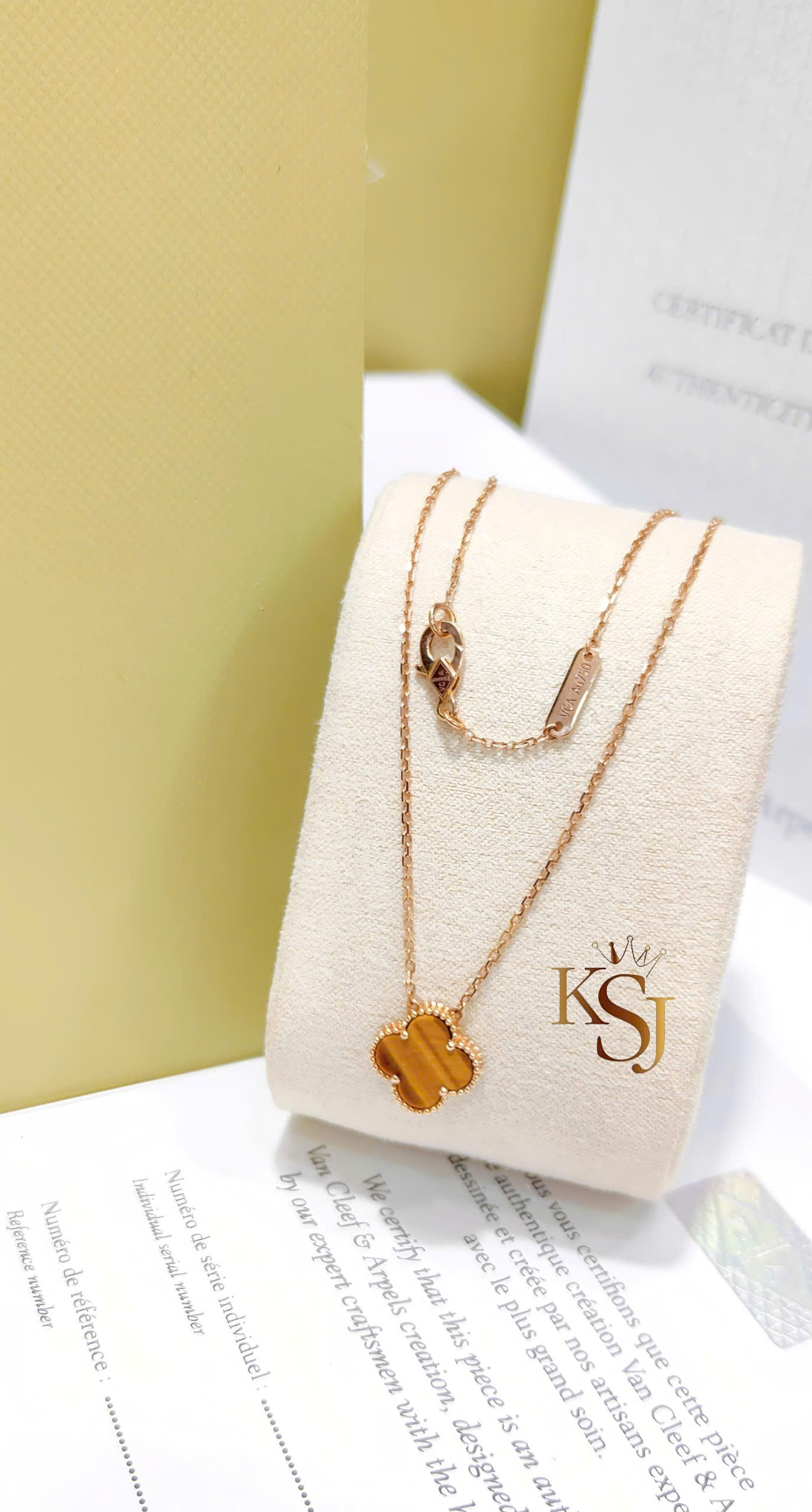 Thiết kế: Hình tượng cỏ bốn lá may mắn với viền hạt vàng tinh xảo, một biểu tượng mang tính di sản của dòng Alhambra kể từ năm 1968