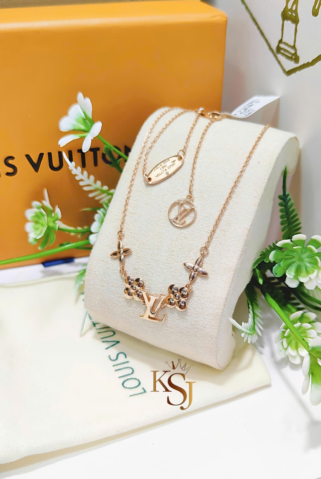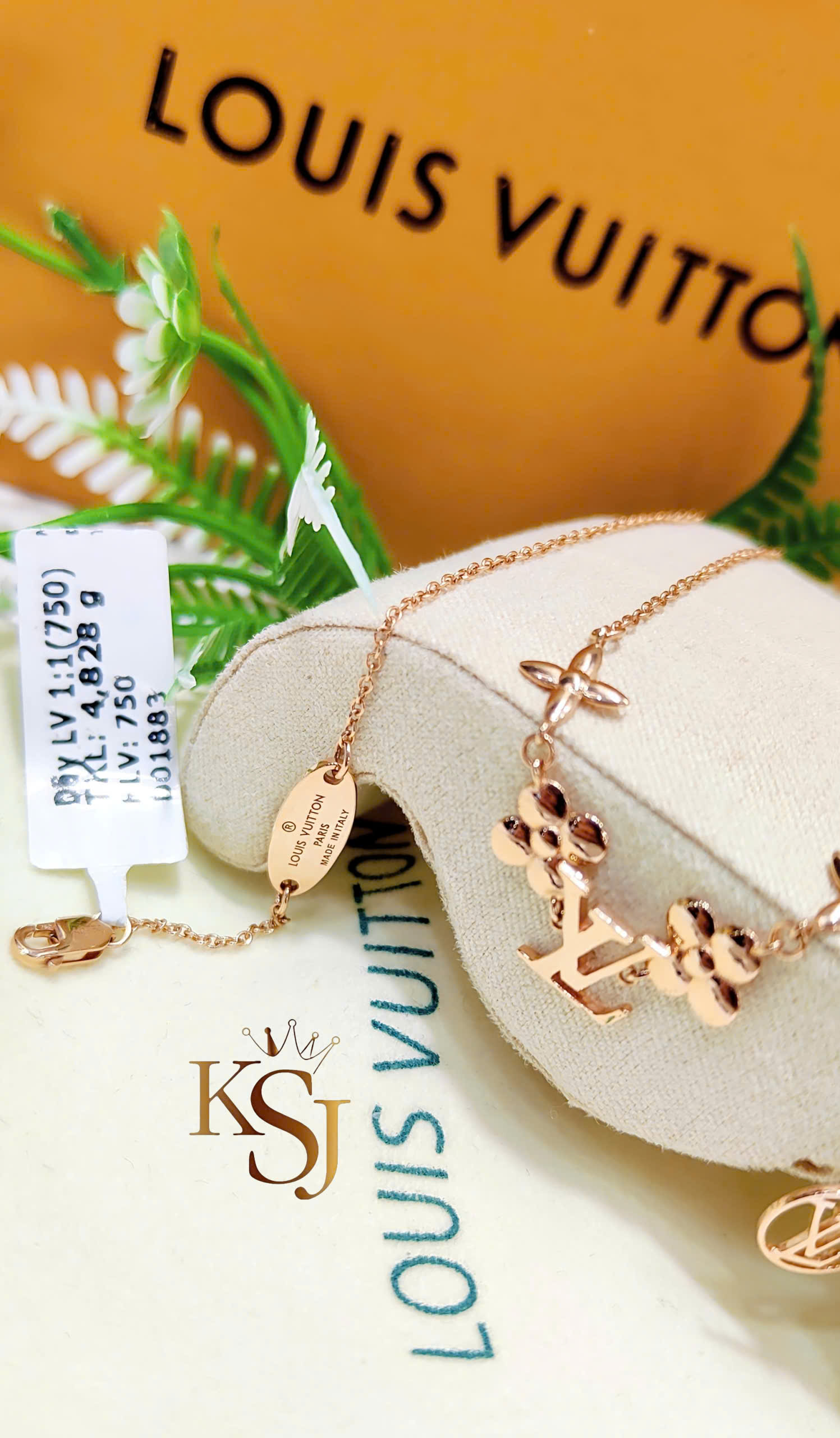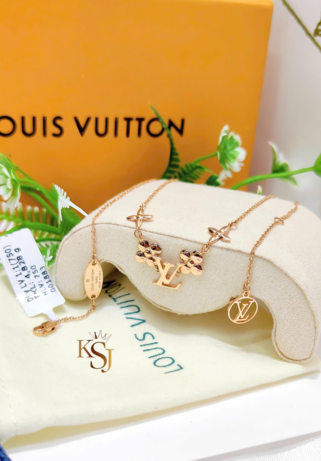 Đặc điểm thiết kế: Dây chuyền mảnh đính các chi tiết biểu tượng LV, hoa bốn cánh (Monogram Flower) với độ hoàn thiện bóng mượt.