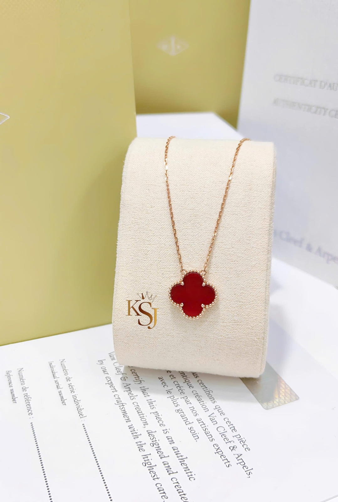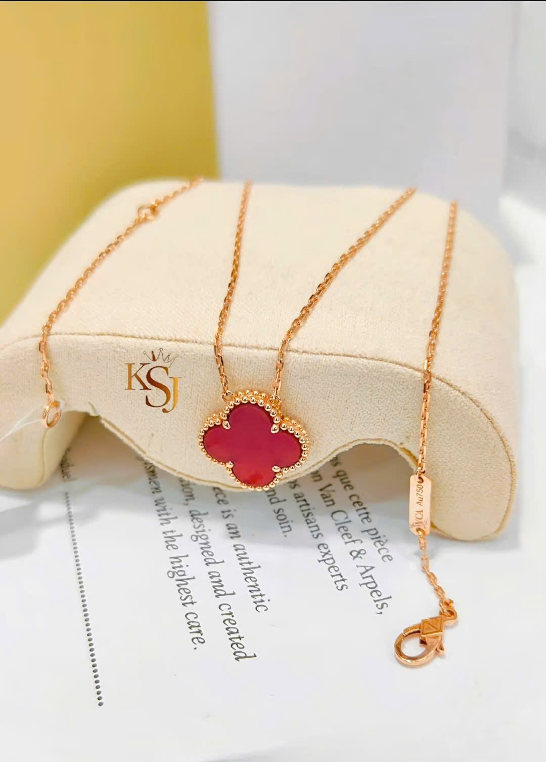 Dây chuyền Vintage Alhambra từ thương hiệu trang sức cao cấp Van Cleef & Arpels. Mẫu thiết kế này nổi tiếng với mặt dây chuyền hình cỏ bốn lá may mắn, được bao quanh bởi các hạt viền vàng tinh xảo.