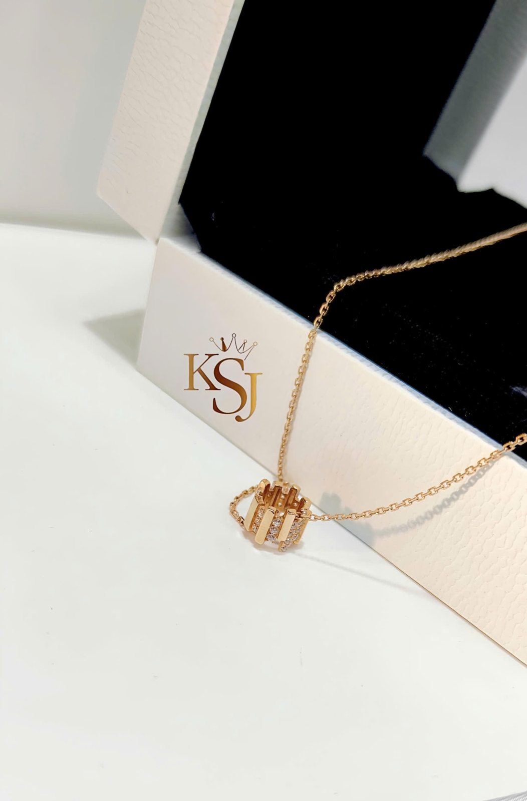 Thiết kế: Dây chuyền có cấu trúc hình học đặc trưng với các khối hình chữ nhật xếp chồng lên nhau không đối xứng, lấy cảm hứng từ các mẫu vải được ghim trên tường tại xưởng may của Christian Dior.