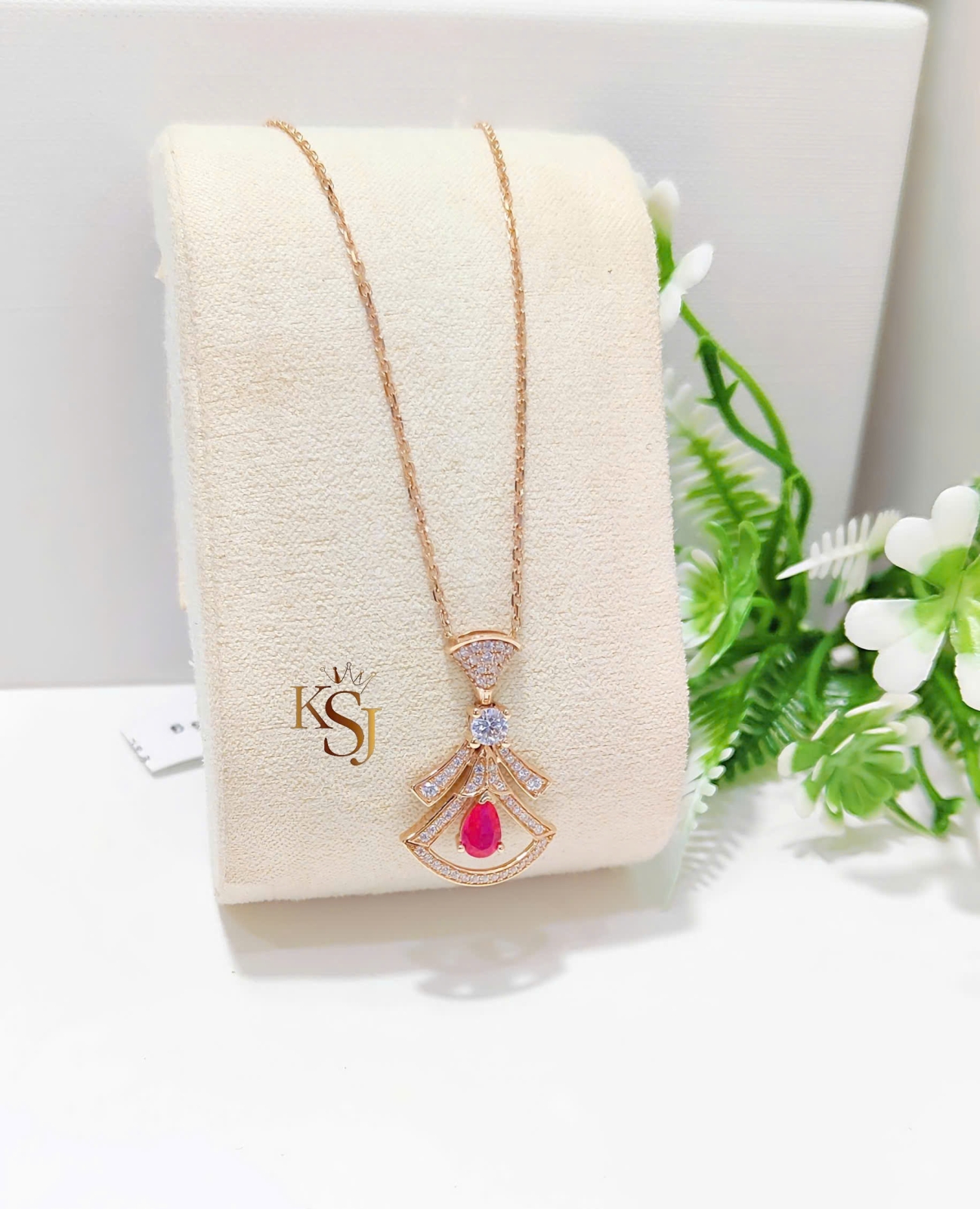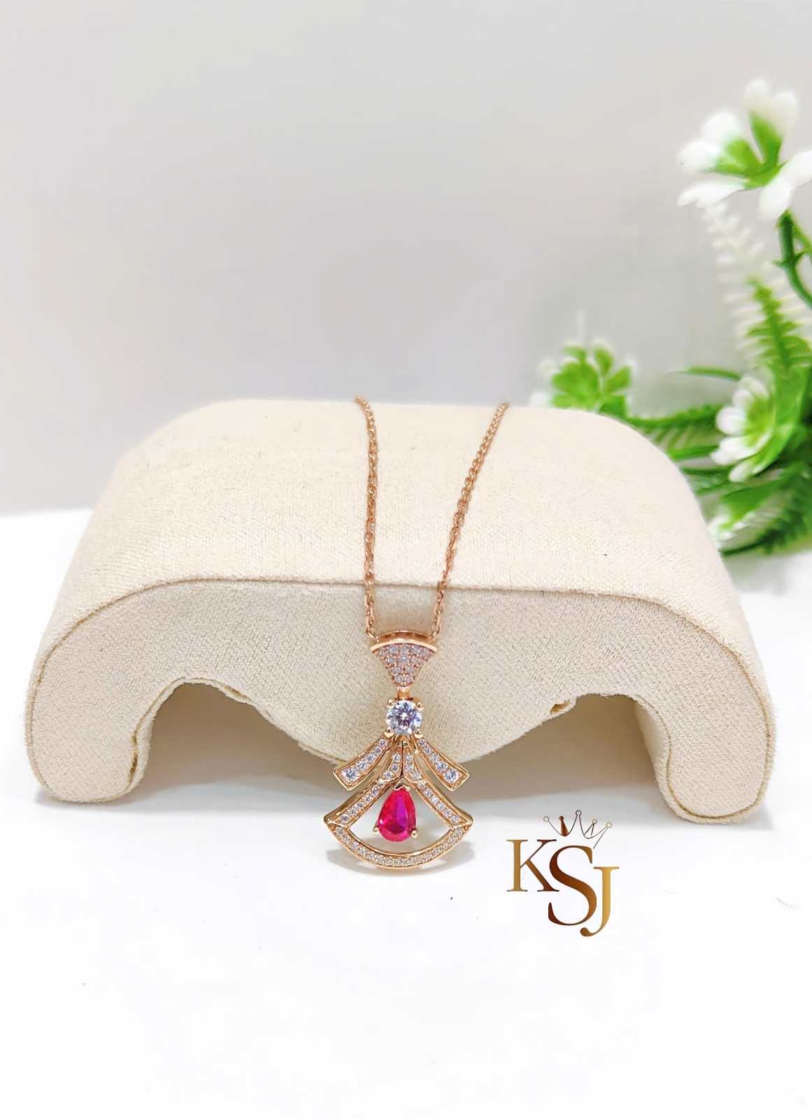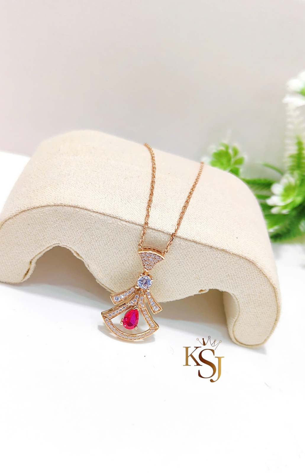 Đá quý: Mặt dây chuyền có thiết kế hình quạt rỗng, đính đá tấm và điểm xuyết một viên đá Đỏ hình giọt nước ở trung tâm. Phía trên thường có một viên đá CZ cắt tròn rực rỡ kết nối phần mặt với dây đeo.