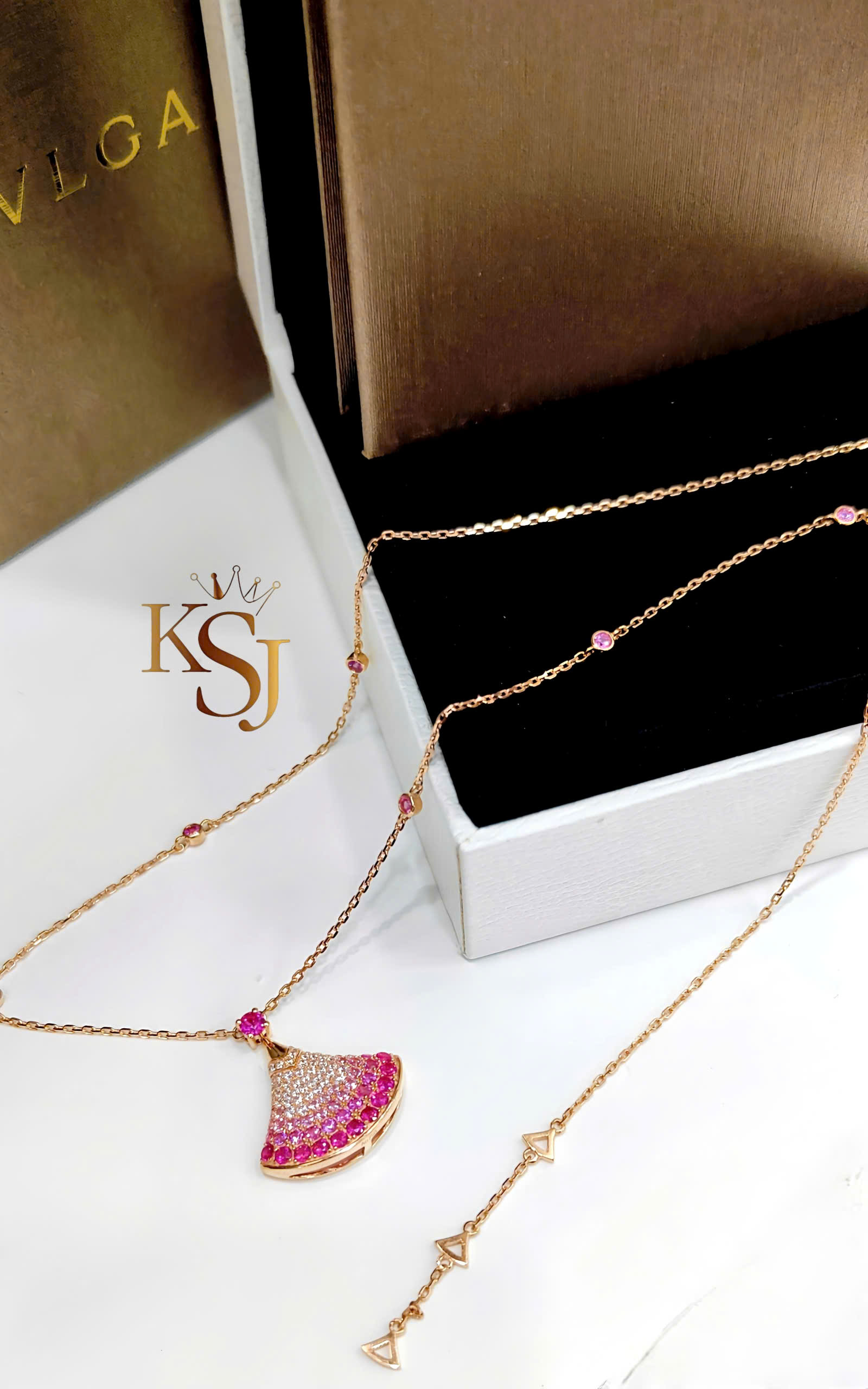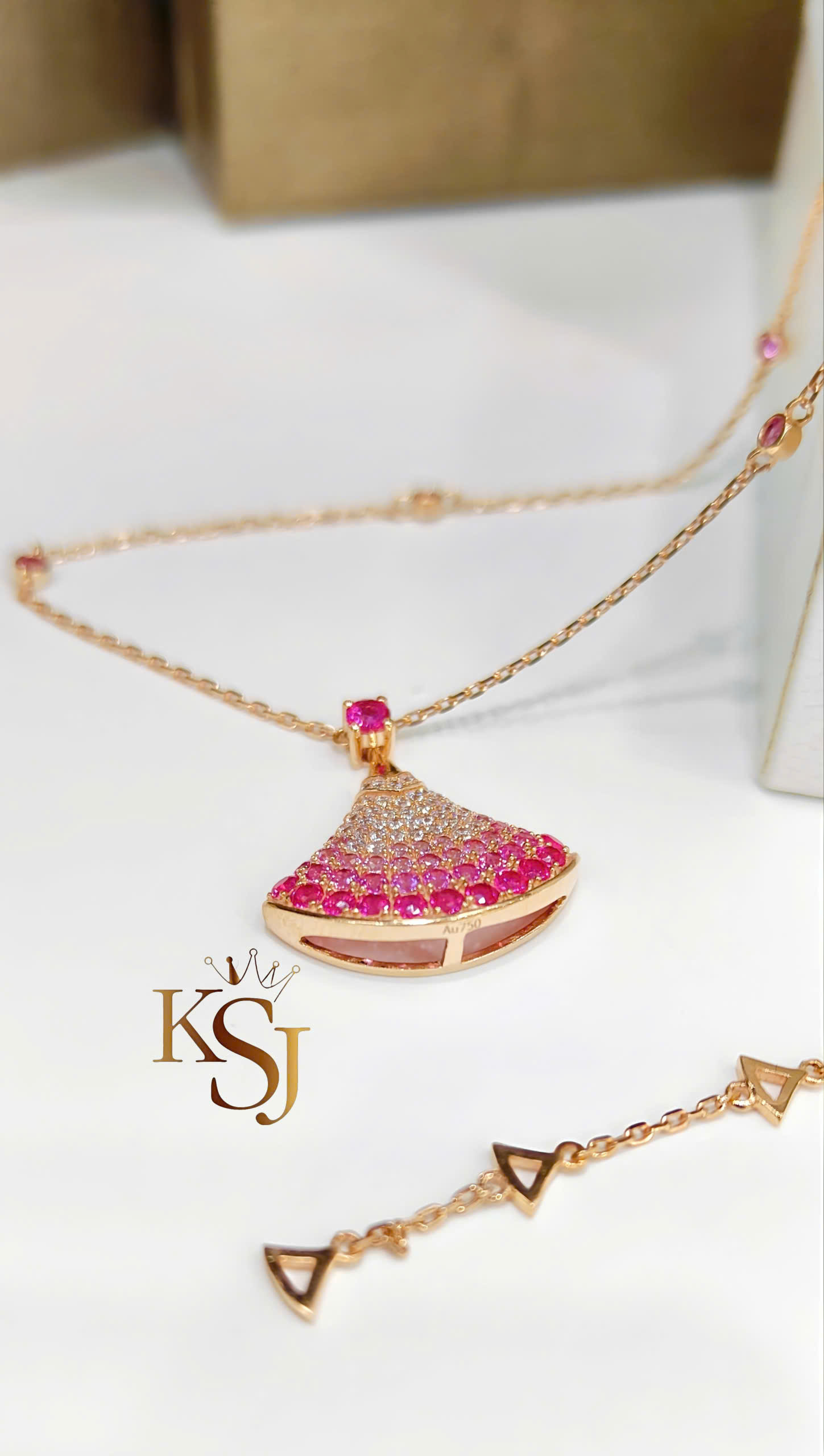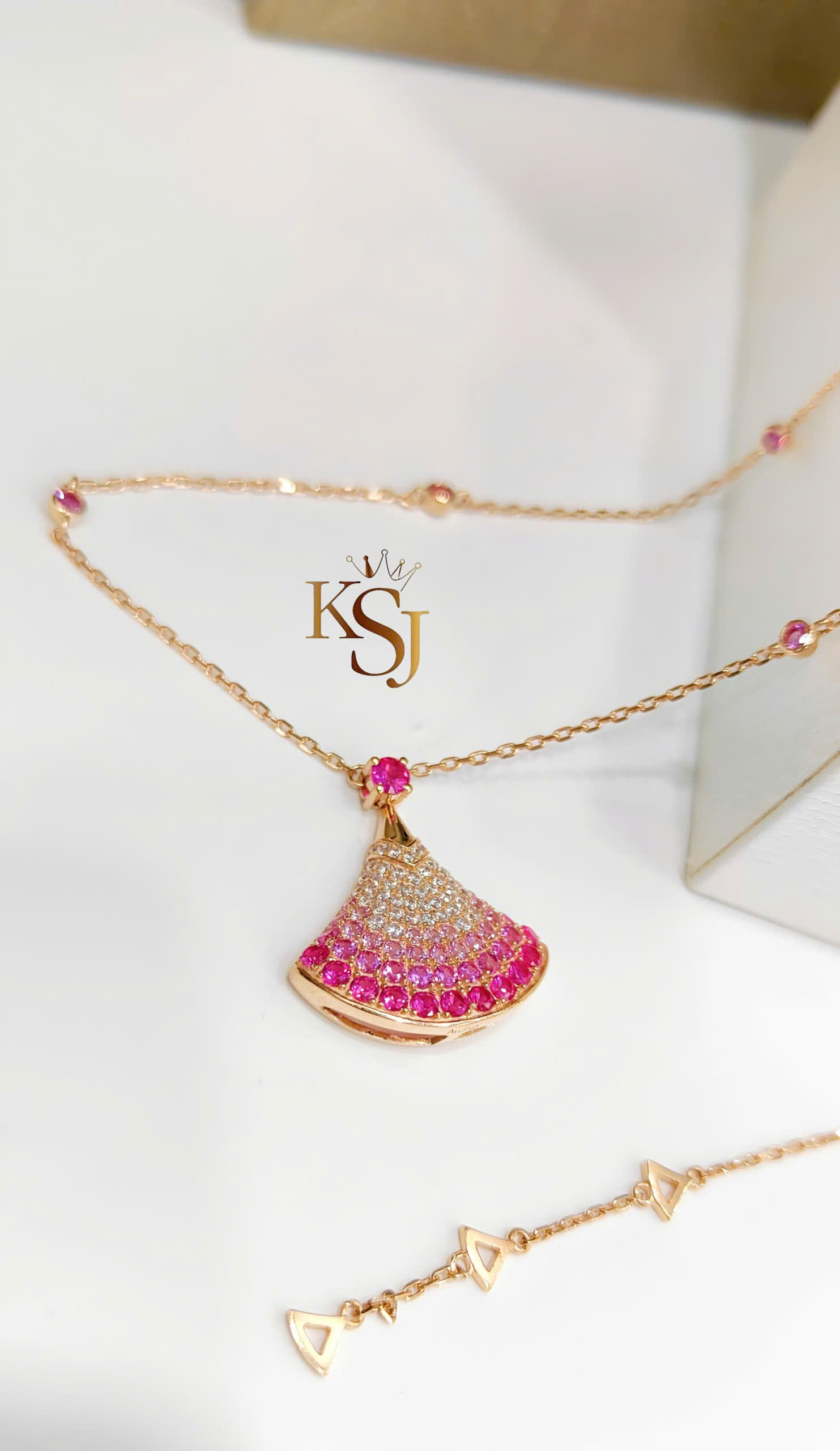 Đá quý: Mặt dây chuyền có hiệu ứng chuyển màu (ombre) rực rỡ, được đính kết từ các loại đá quý như đá CZ hồng