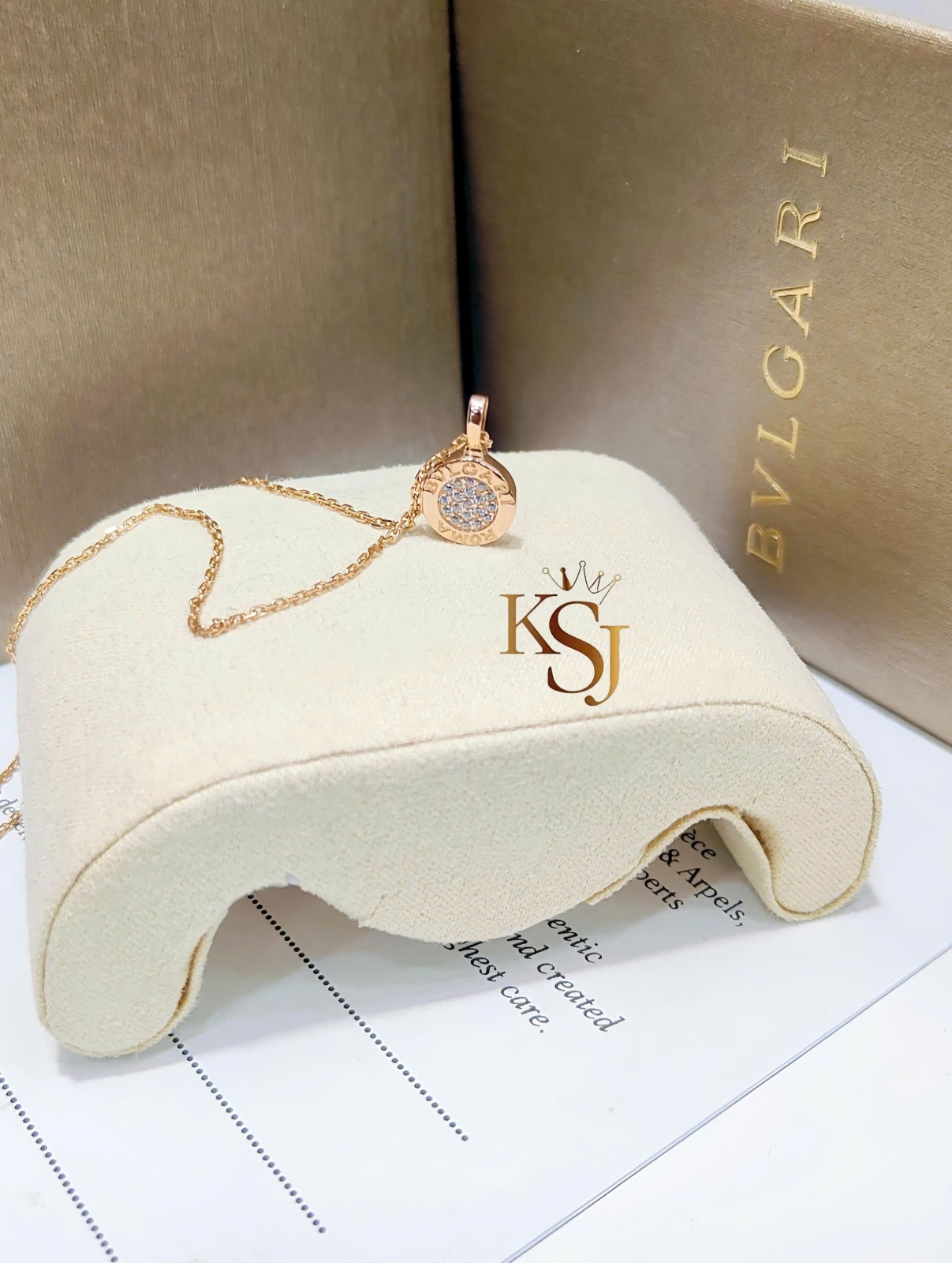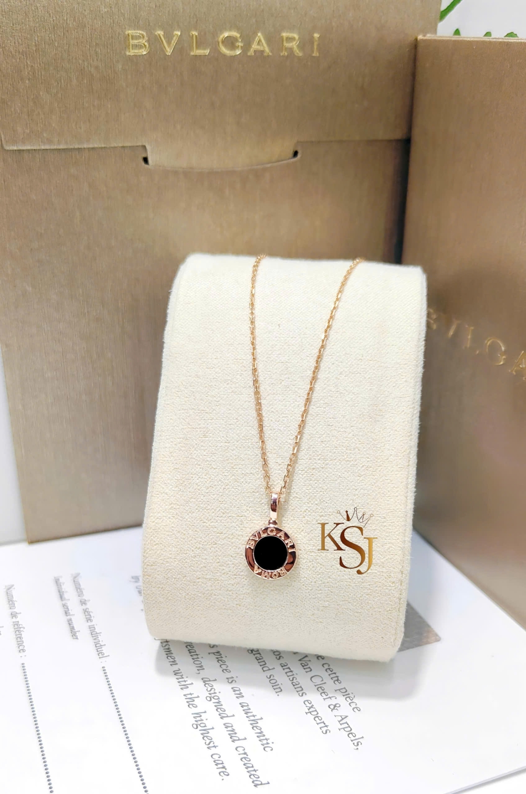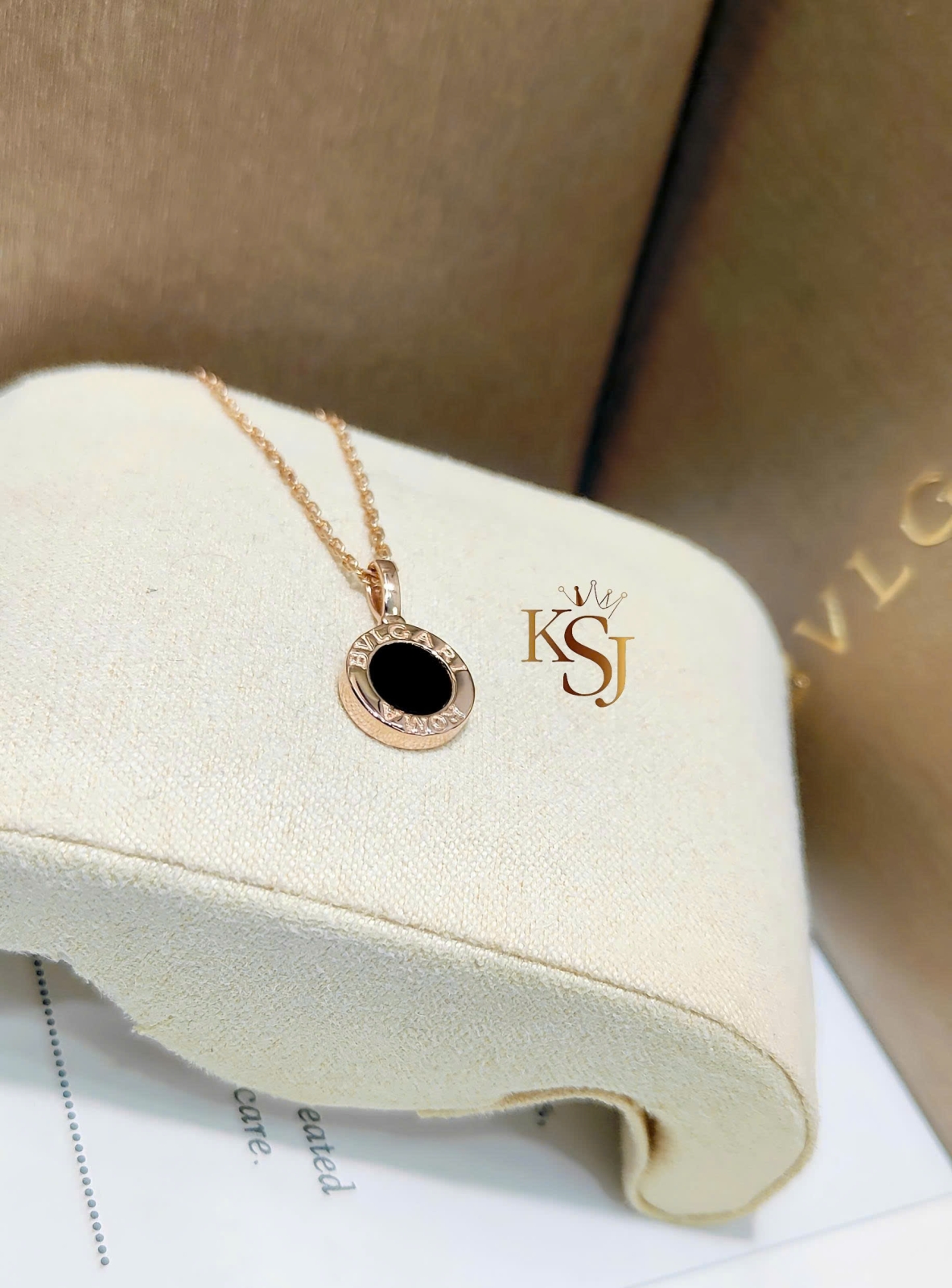 Mặt dây chuyền: Điểm nhấn là viên đá Onyx đen (mã não đen) sang trọng ở giữa, bao quanh bởi logo Bvlgari kép đặc trưng.