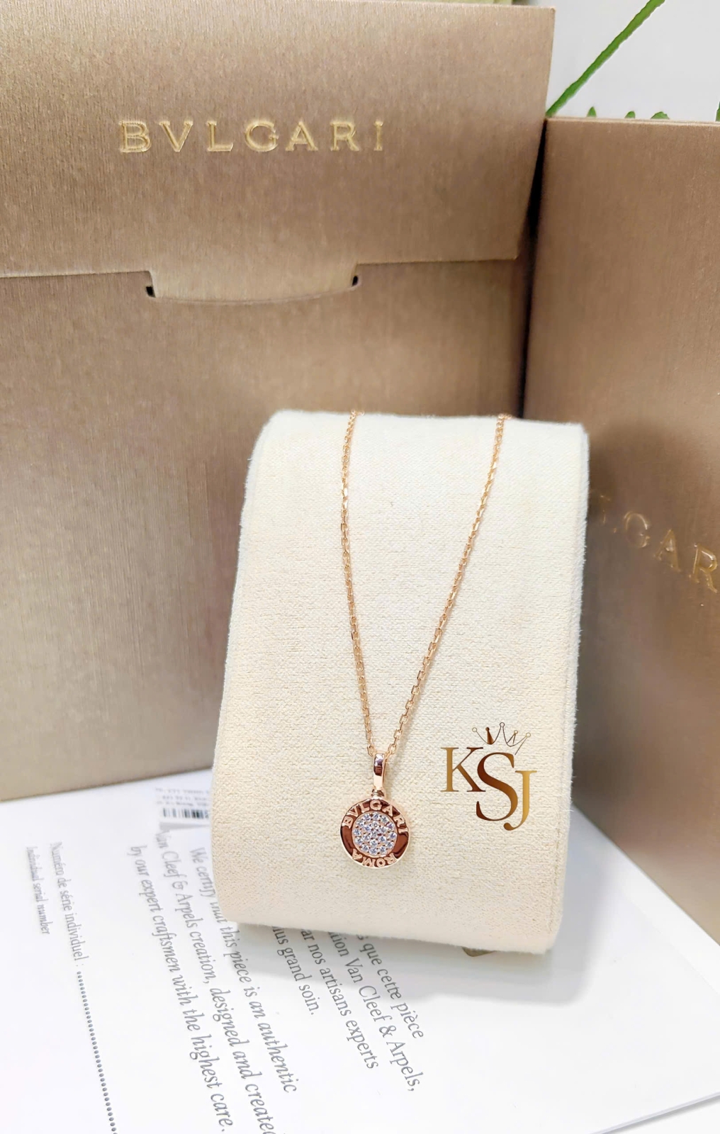 Mẫu dây chuyền là BVLGARI BVLGARI Necklace, một thiết kế mang tính biểu tượng được lấy cảm hứng từ những dòng chữ cong trên đồng xu La Mã cổ đại
