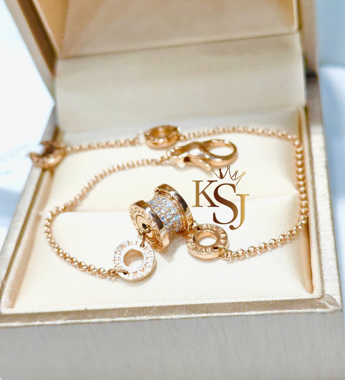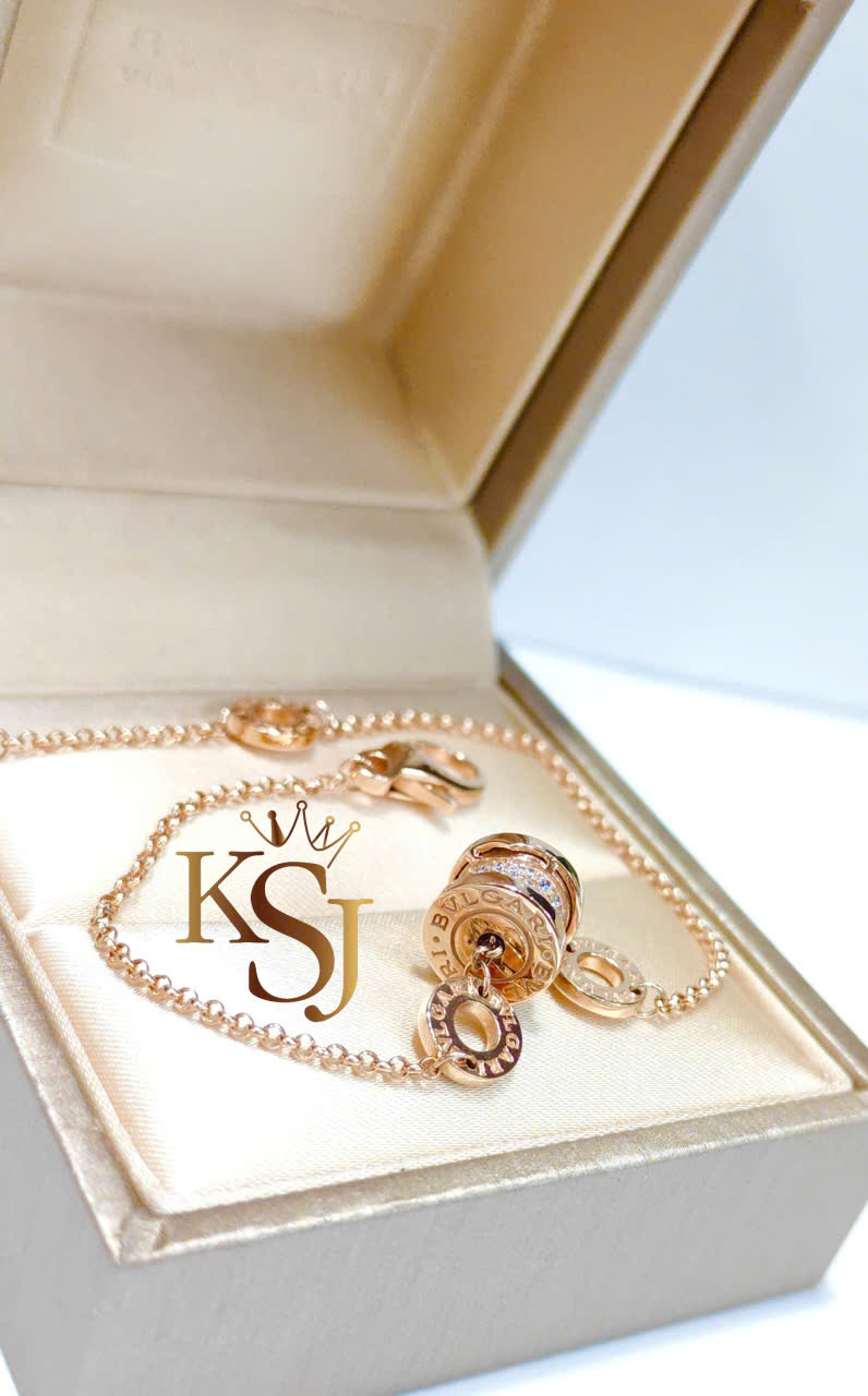 Lắc tay Bvlgari B.zero1 được làm từ vàng hồng 18K với các chi tiết đính đá CZ. Thiết kế này mang tính biểu tượng với motif hình trụ xoắn ốc lấy cảm hứng từ Đấu trường La Mã Colosseum, kết hợp giữa sự sang trọng cổ điển và nét hiện đại.