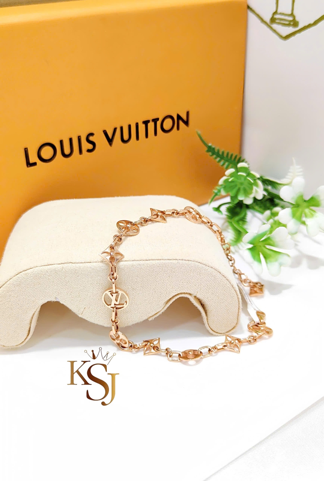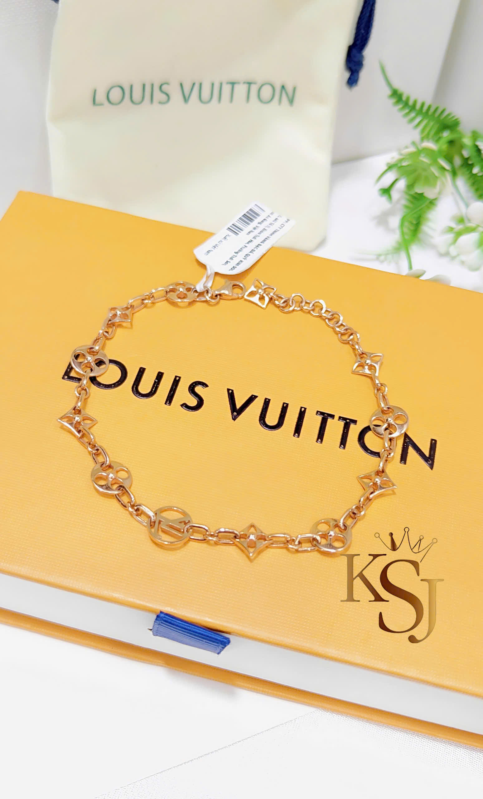Mẫu lắc tay Louis Vuitton với các họa tiết biểu tượng như logo LV lồng nhau và hoa Monogram bốn cánh