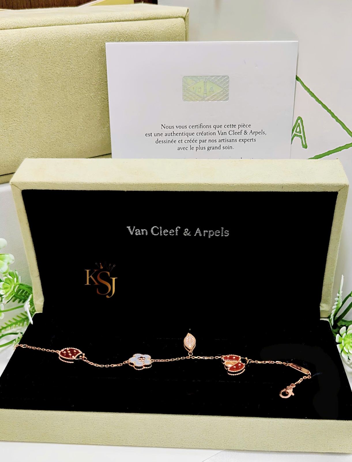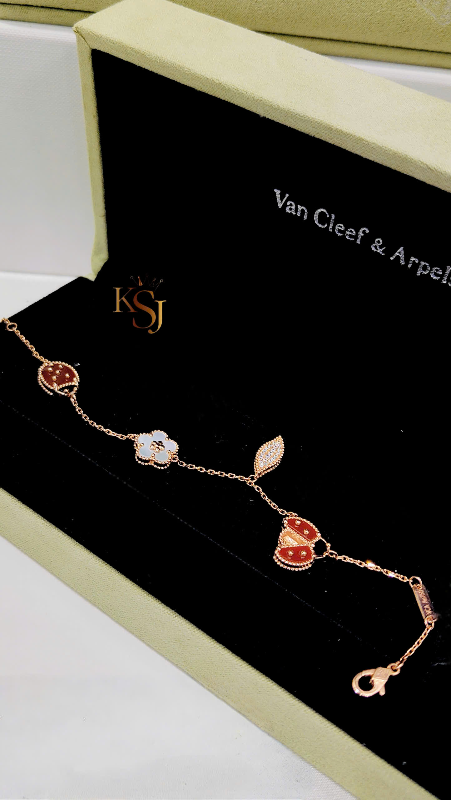 Chiếc lắc tay Lucky Spring 5 họa tiết của thương hiệu cao cấp Van Cleef & Arpels. Đây là một phần trong bộ sưu tập lấy cảm hứng từ thiên nhiên và sự may mắn của mùa xuân