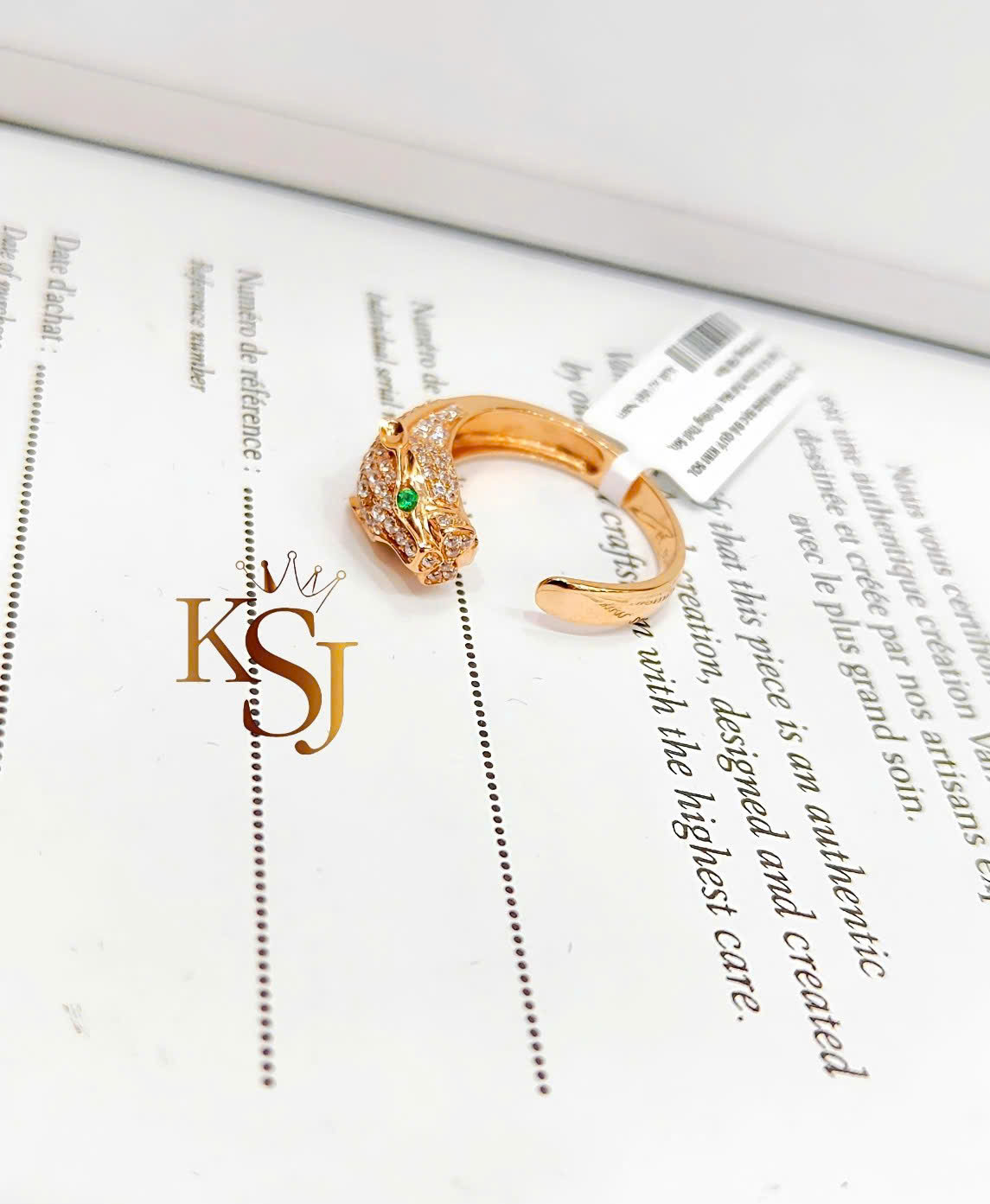 Thiết kế: Chiếc nhẫn có hình dáng một con báo quấn quanh ngón tay, với các chi tiết đính đá CZ toàn thân báo. Điểm nhấn quan trọng là đôi mắt xanh