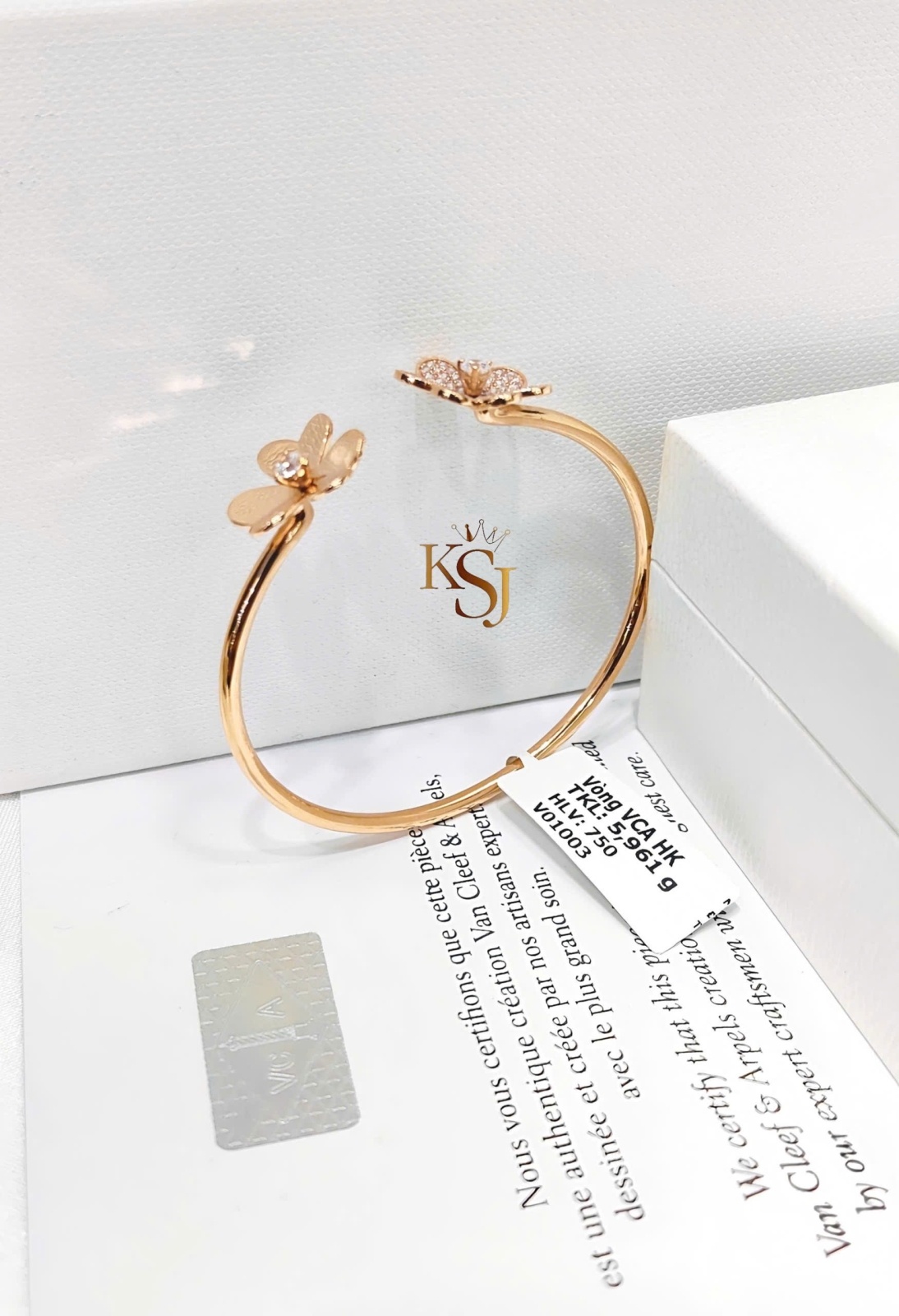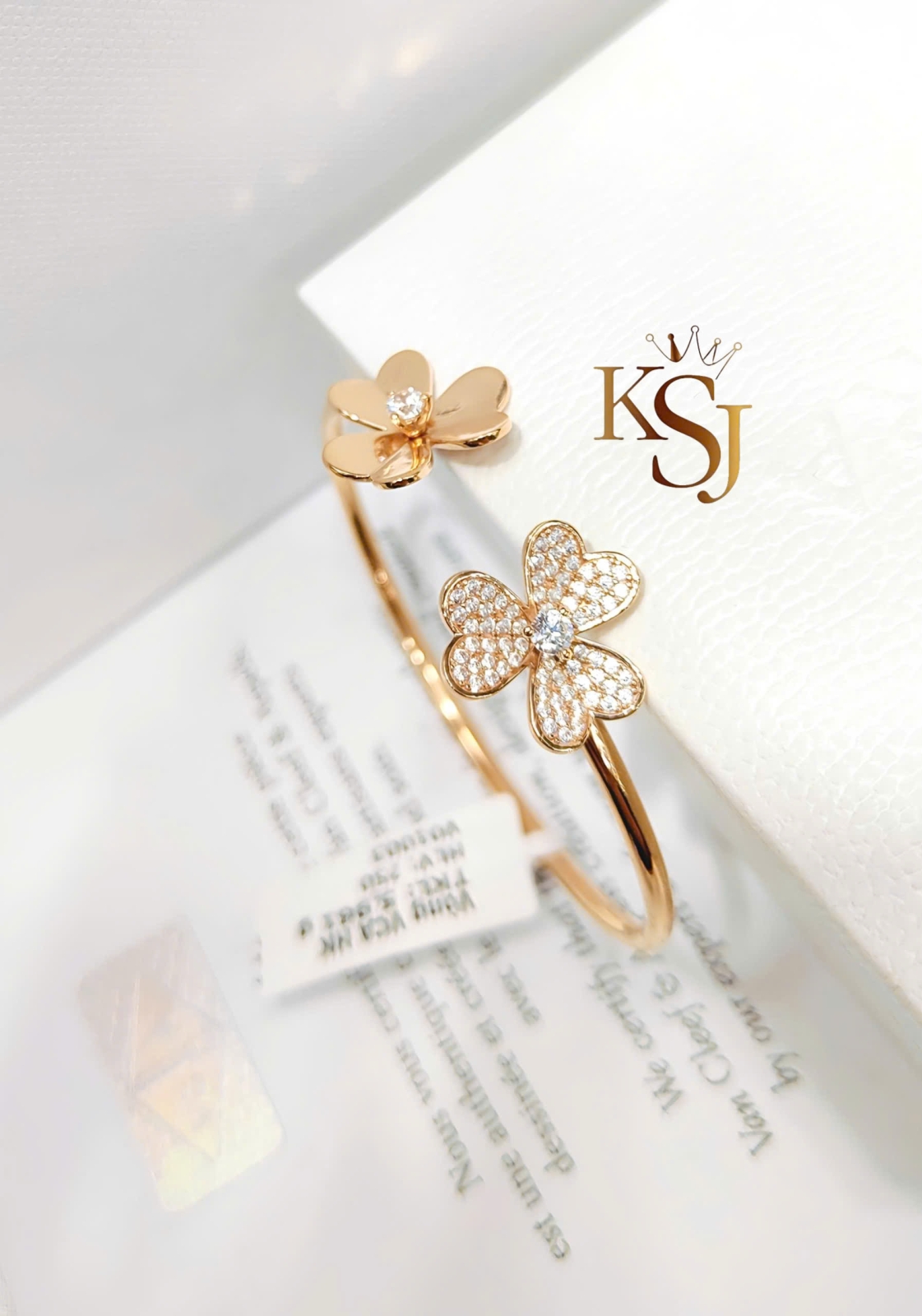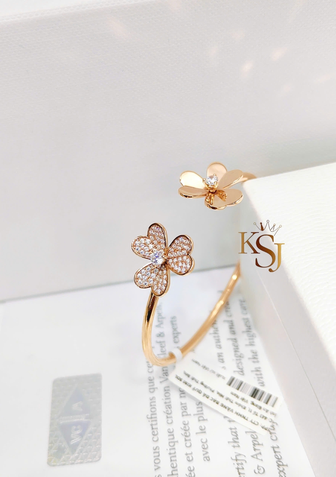 Chiếc vòng tay này có thiết kế dạng vòng hở (cuff) với hai đầu là họa tiết hoa được đính đá lấp lánh trên chất liệu vàng hồng. Được lấy cảm hứng từ thương hiệu trang sức cao cấp Van Cleef & Arpels