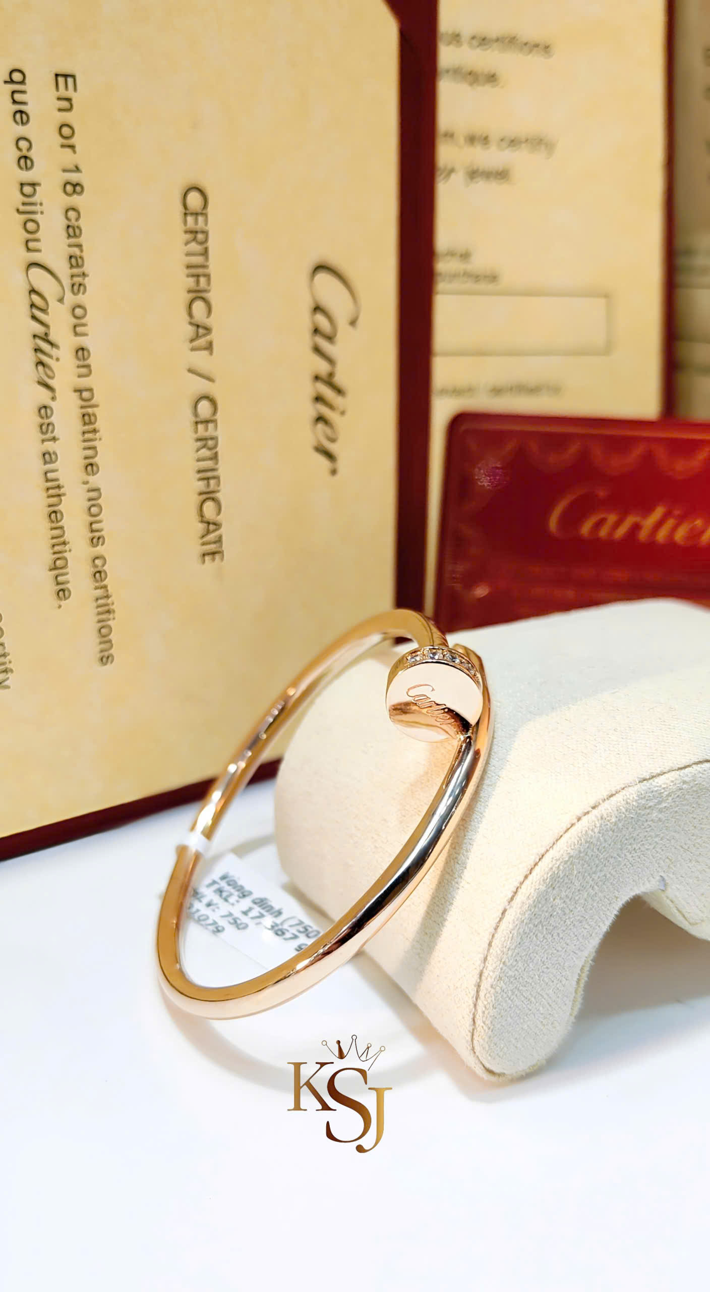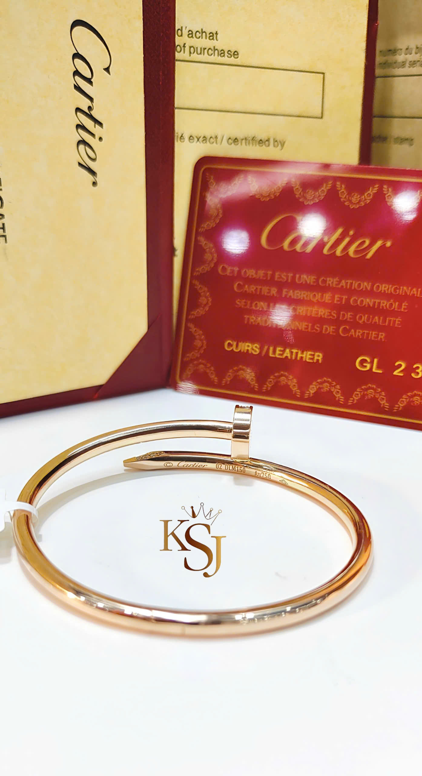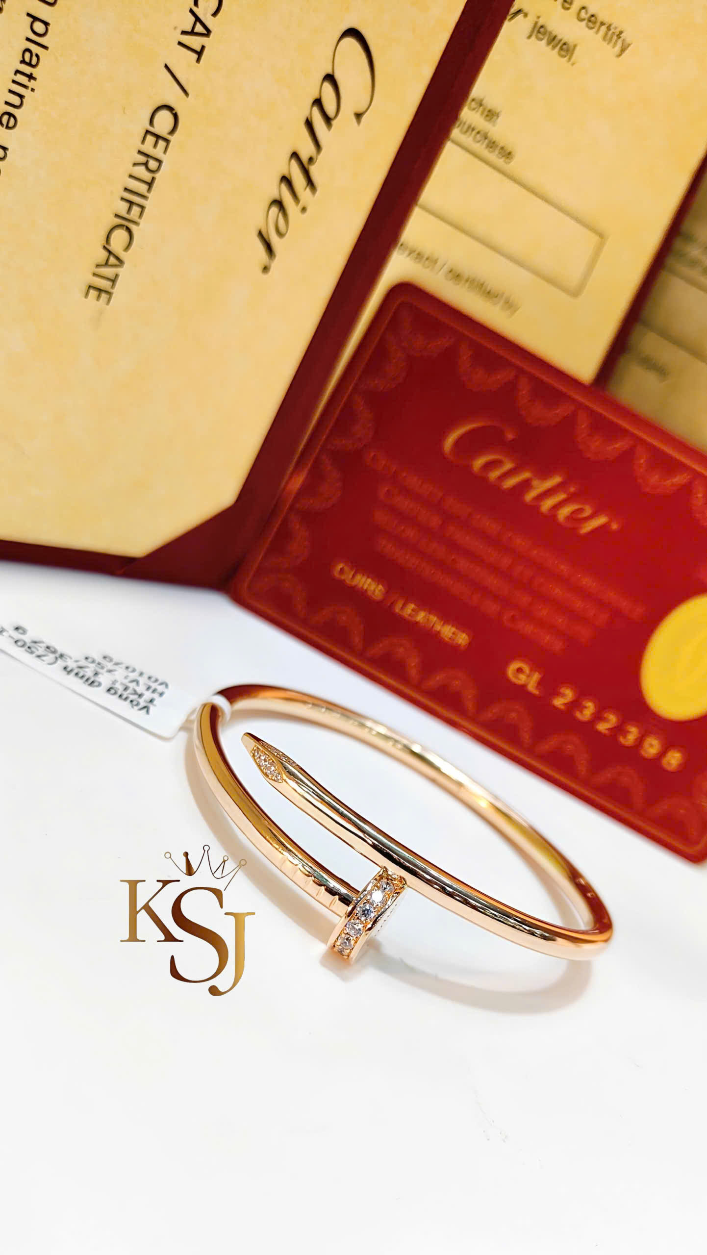 Chiếc vòng Juste un Clou trứ danh của thương hiệu Cartier, thường được biết đến với tên gọi dân dã là "vòng tay đinh.  Đây là phiên bản Juste un Clou bản nhỏ (Small Model) được đínhđá CZ ở phần đầu đinh. Chiếc vòng này được làm từ vàng hồng 18K (750), mang phong cách thiết kế hiện đại, phá cách nhưng vẫn giữ được nét sang trọng