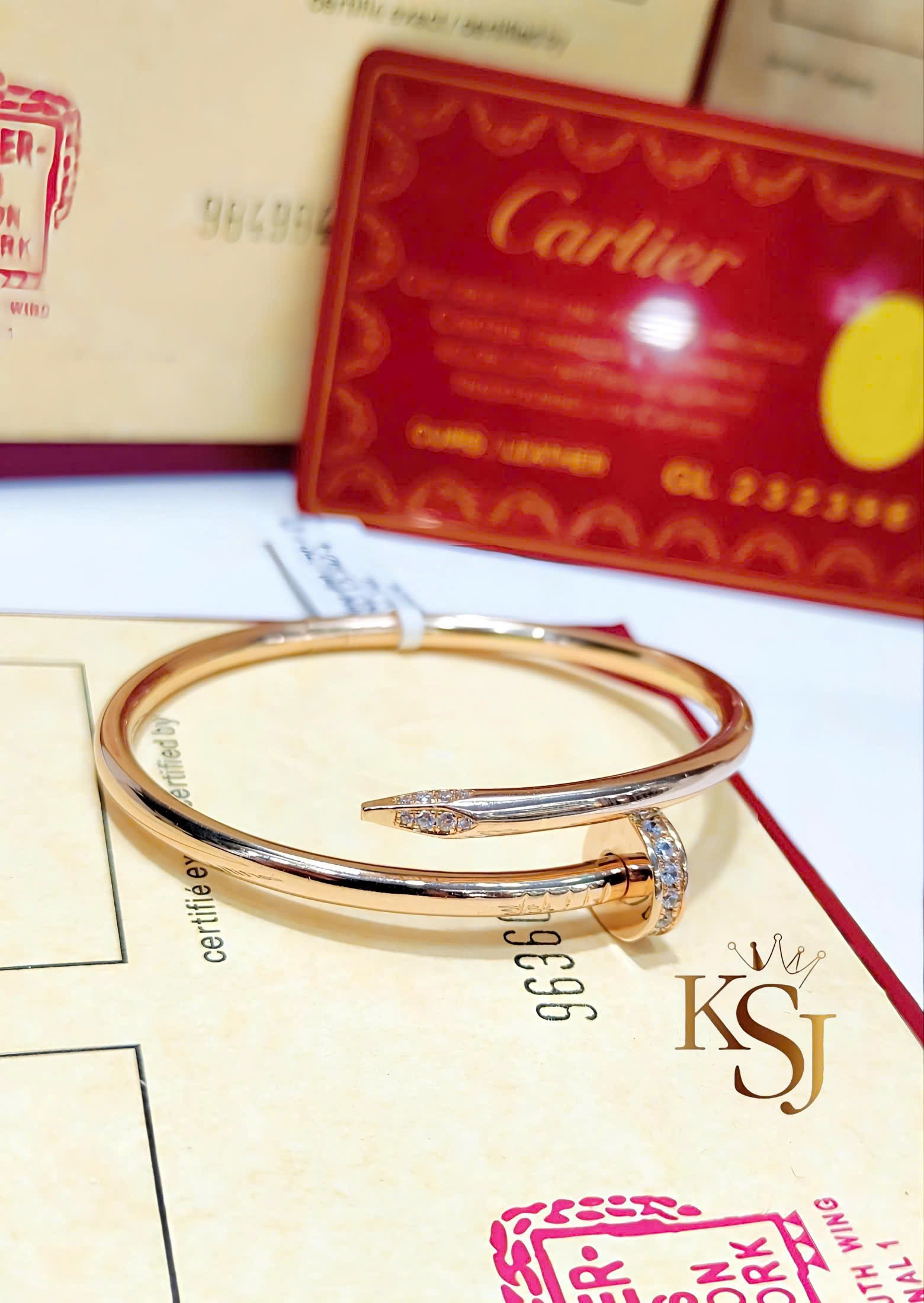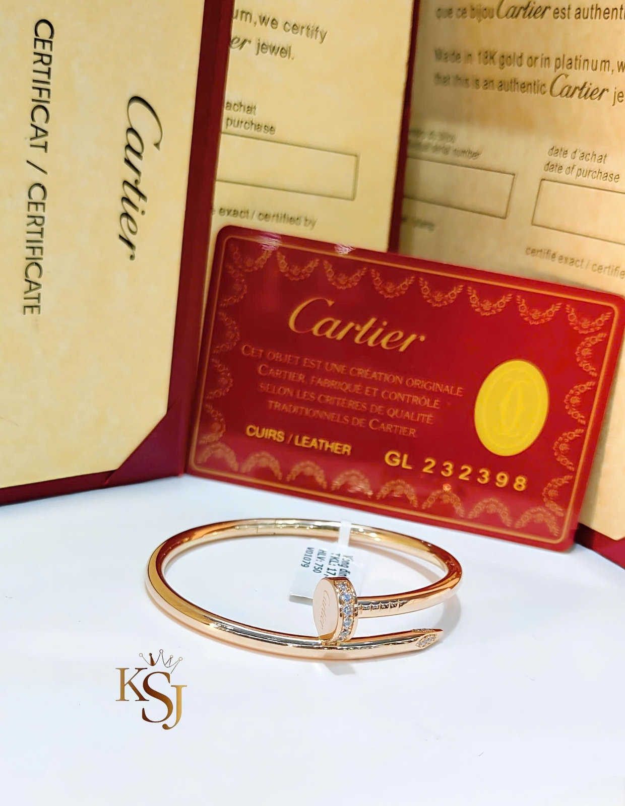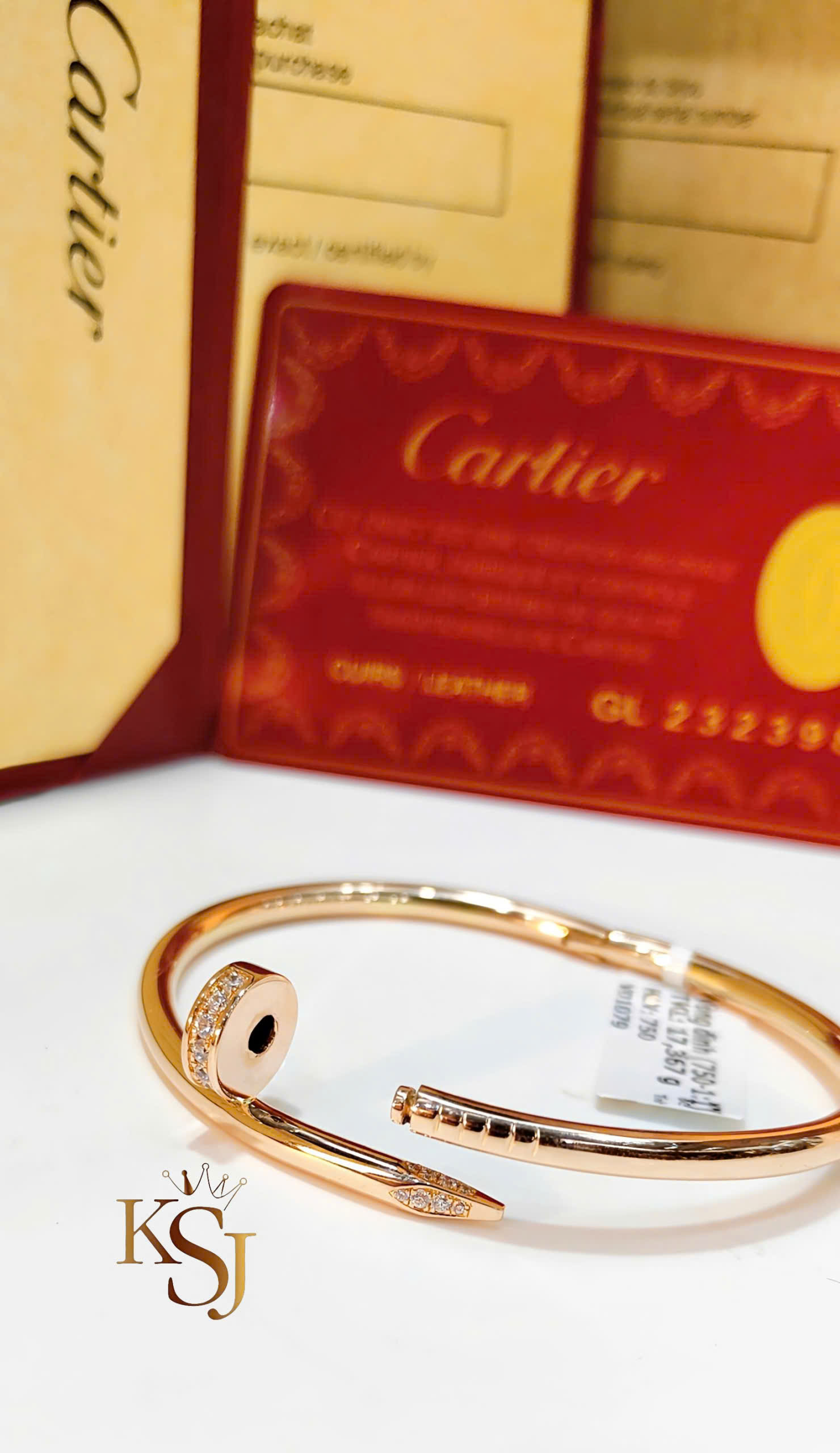 Chiếc vòng Juste un Clou trứ danh của thương hiệu Cartier, thường được biết đến với tên gọi dân dã là "vòng tay đinh.  Đây là phiên bản Juste un Clou bản nhỏ (Small Model) được đínhđá CZ ở phần đầu đinh. Chiếc vòng này được làm từ vàng hồng 18K (750), mang phong cách thiết kế hiện đại, phá cách nhưng vẫn giữ được nét sang trọng