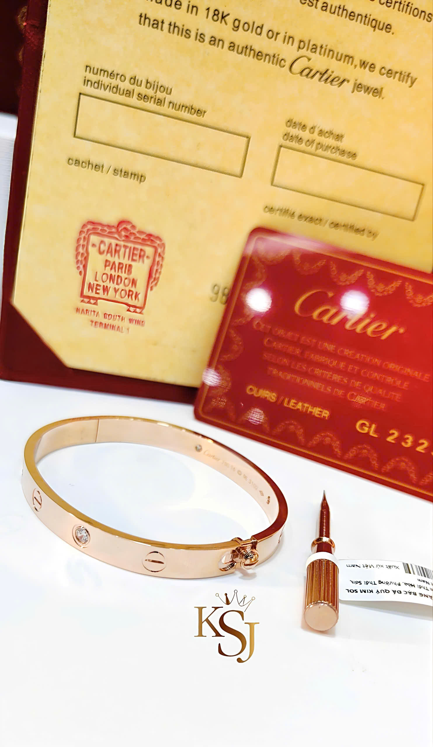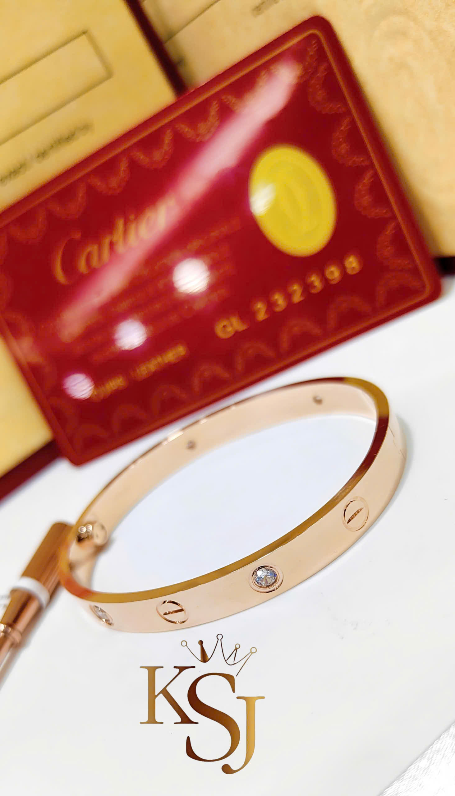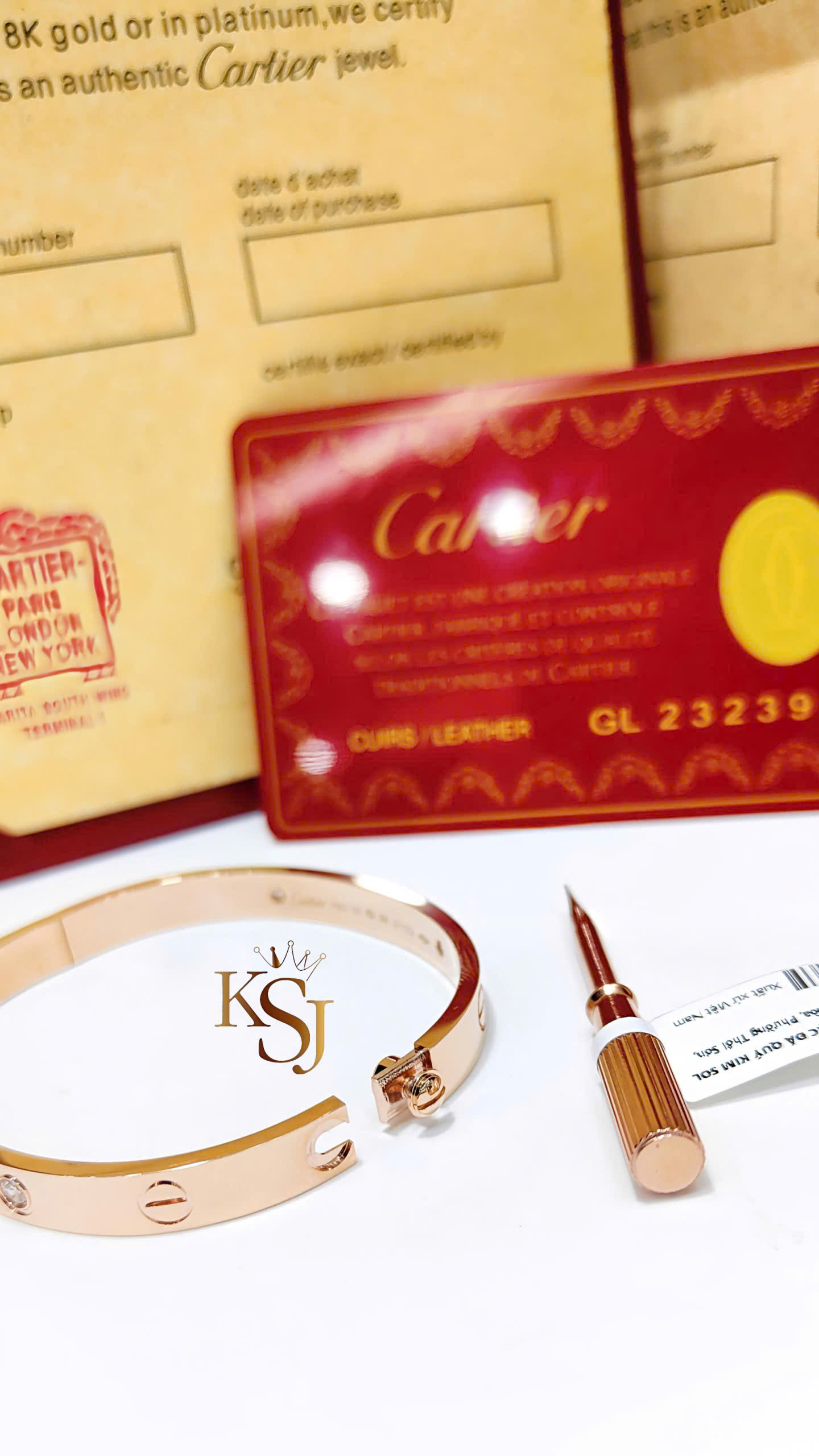 Chiếc vòng tay là mẫu Love Bracelet biểu tượng của thương hiệu cao cấp Cartier .Đây là một thiết kế trang sức kinh điển, nổi bật với họa tiết hình ốc vít đặc trưng quanh vòng.