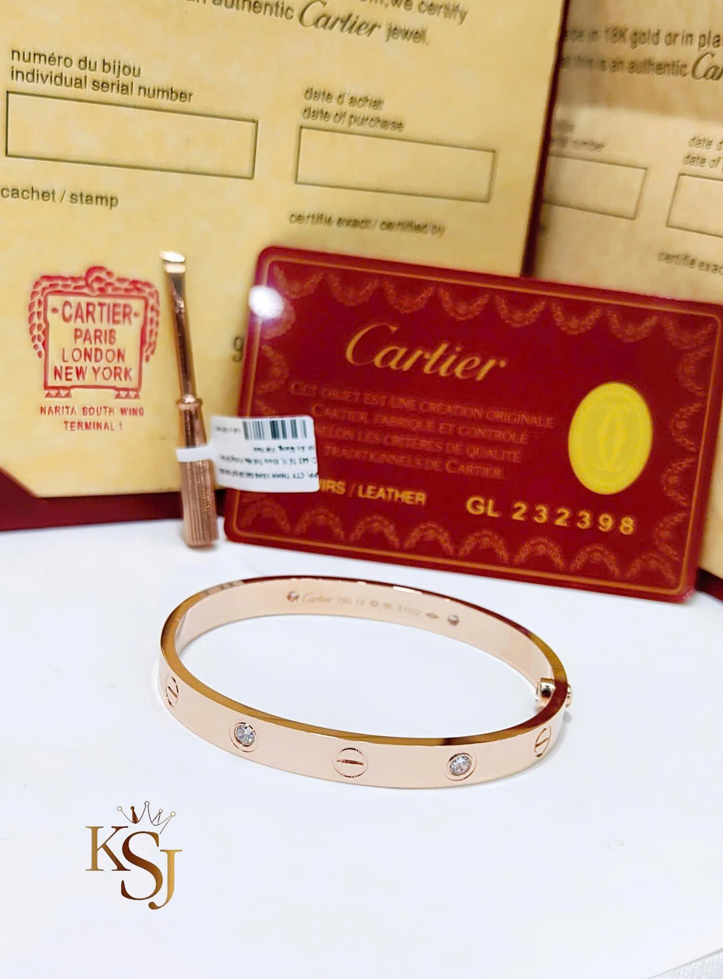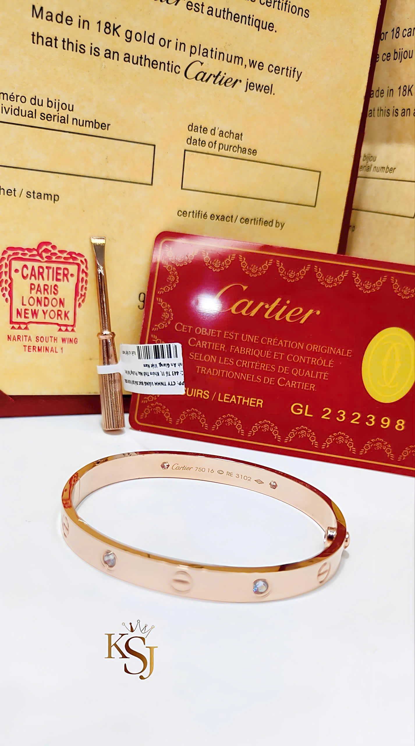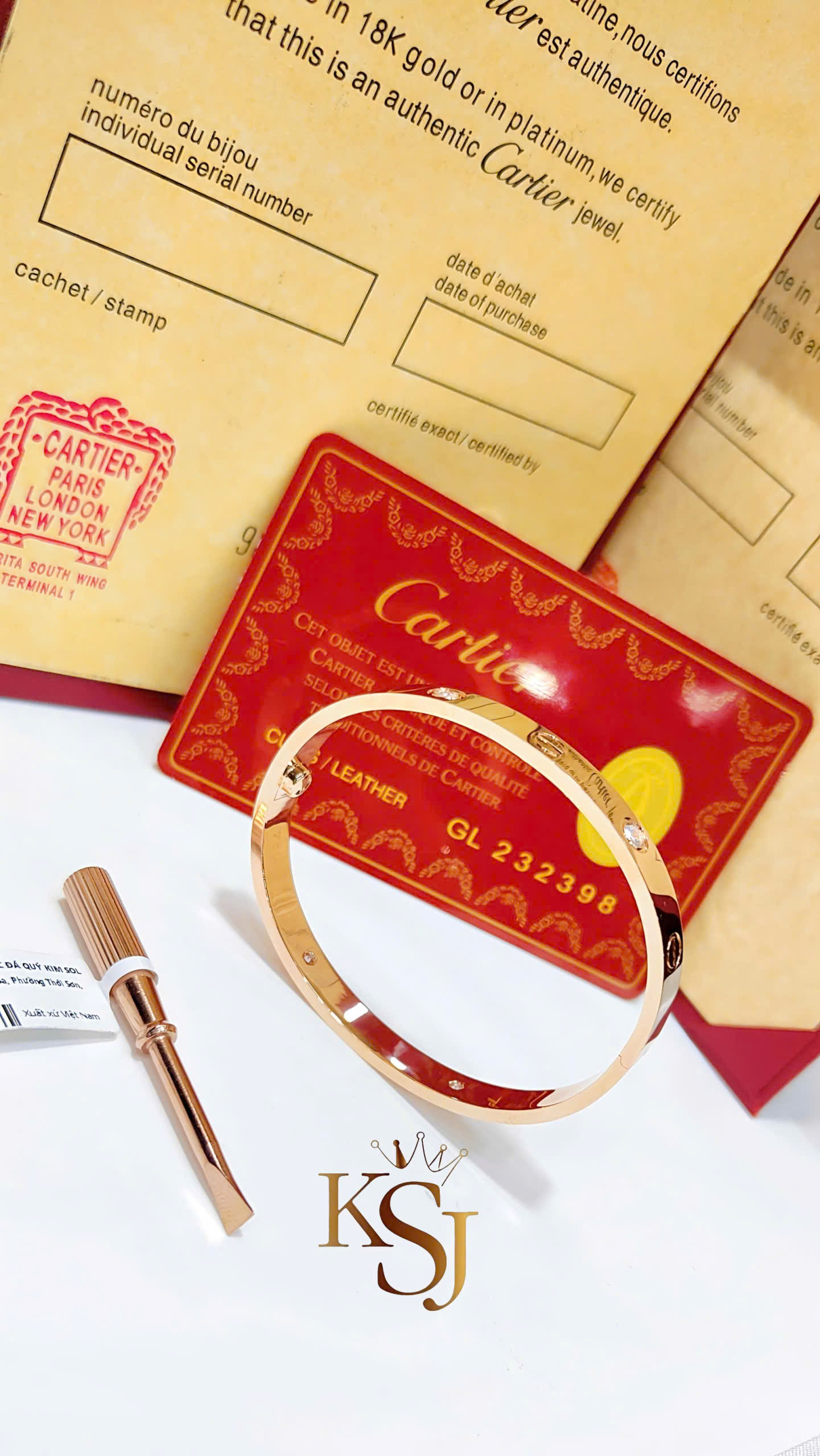 Chiếc vòng tay là mẫu Love Bracelet biểu tượng của thương hiệu cao cấp Cartier .Đây là một thiết kế trang sức kinh điển, nổi bật với họa tiết hình ốc vít đặc trưng quanh vòng.