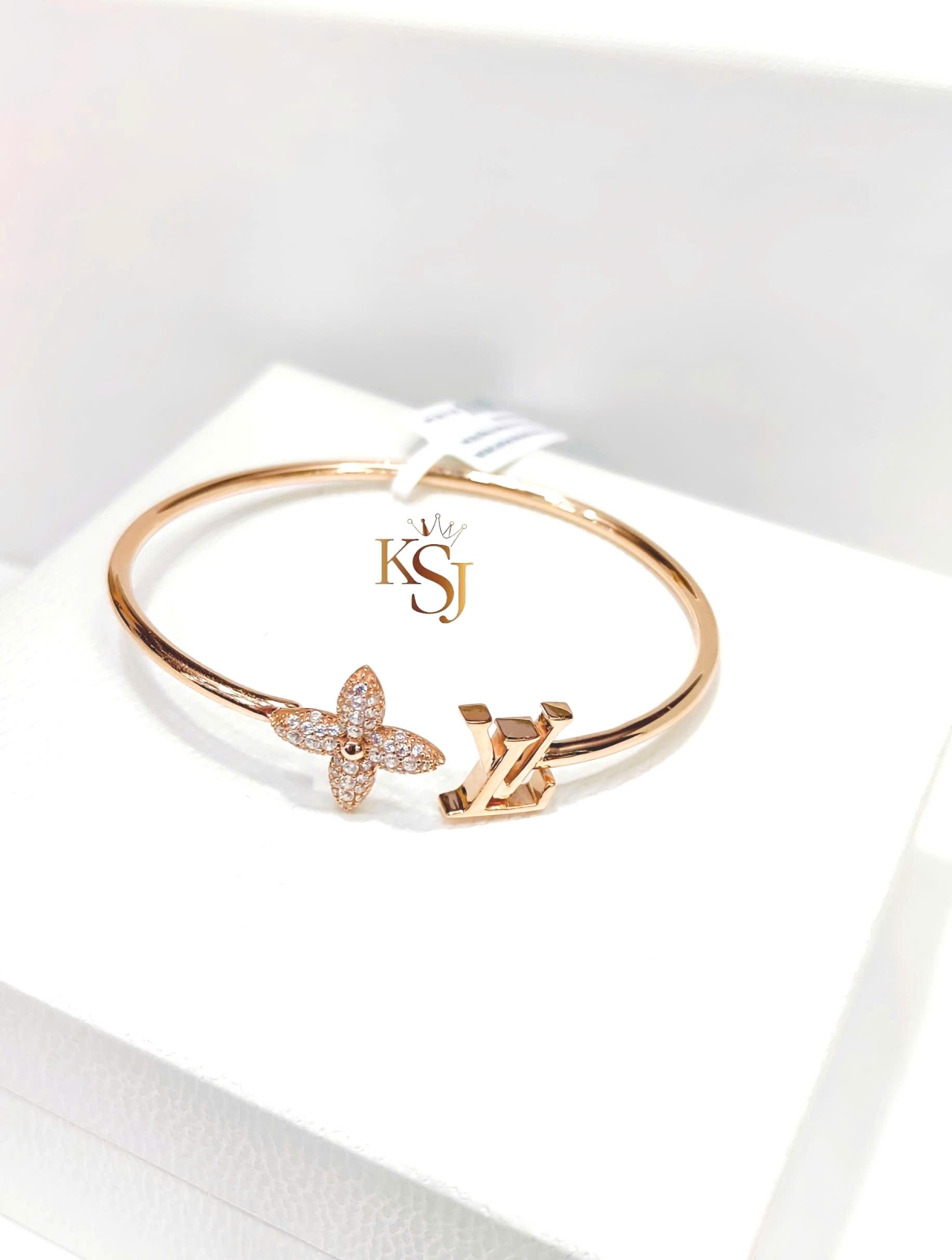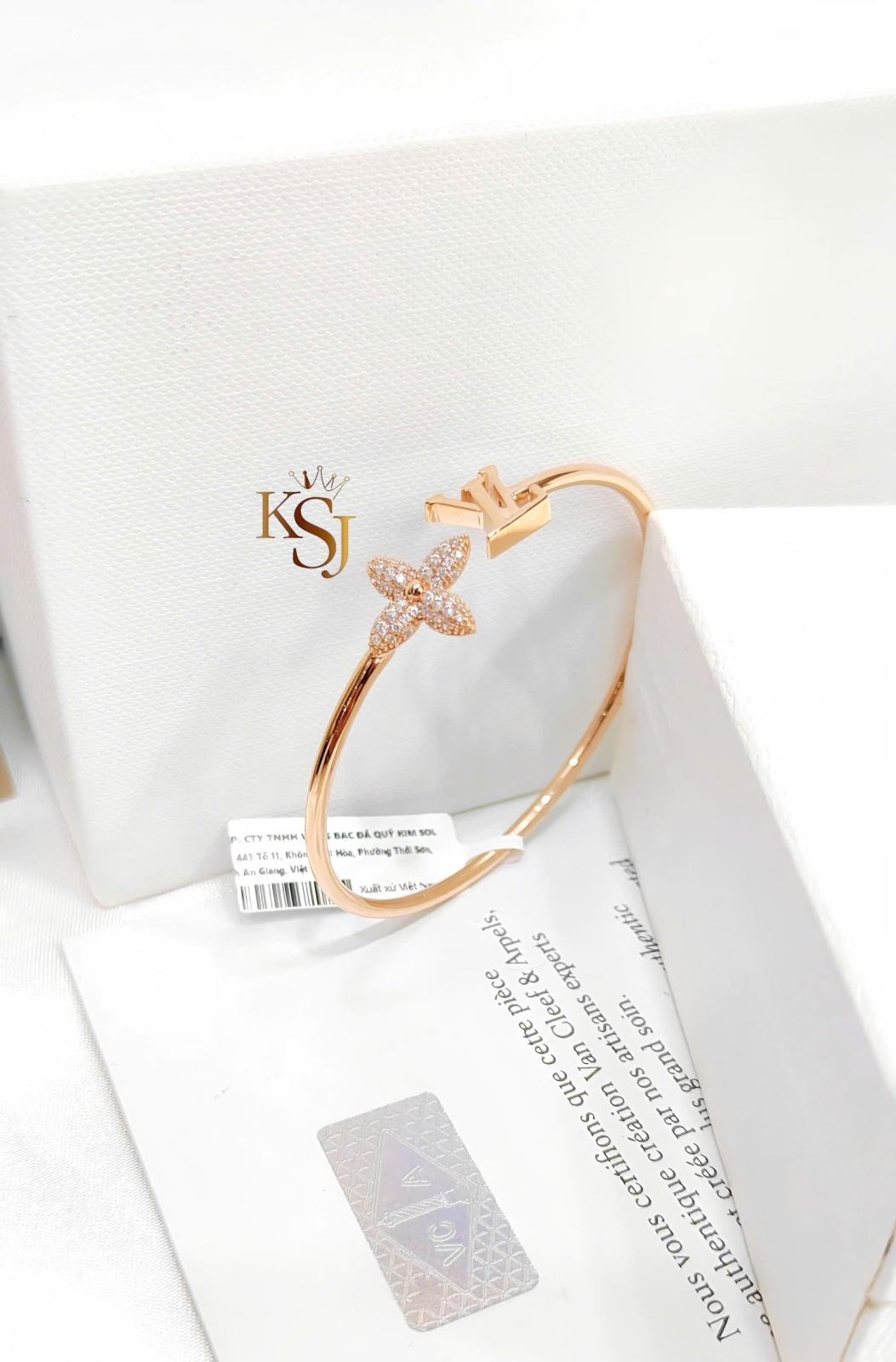 Đặc điểm: Một đầu vòng là chữ LV viết lồng, đầu còn lại là bông hoa 4 cánh nhọn được đính đá tỉ mỉ.