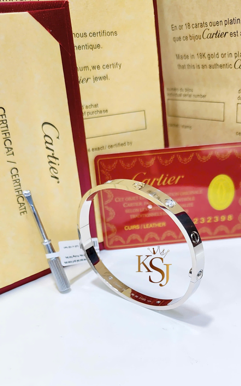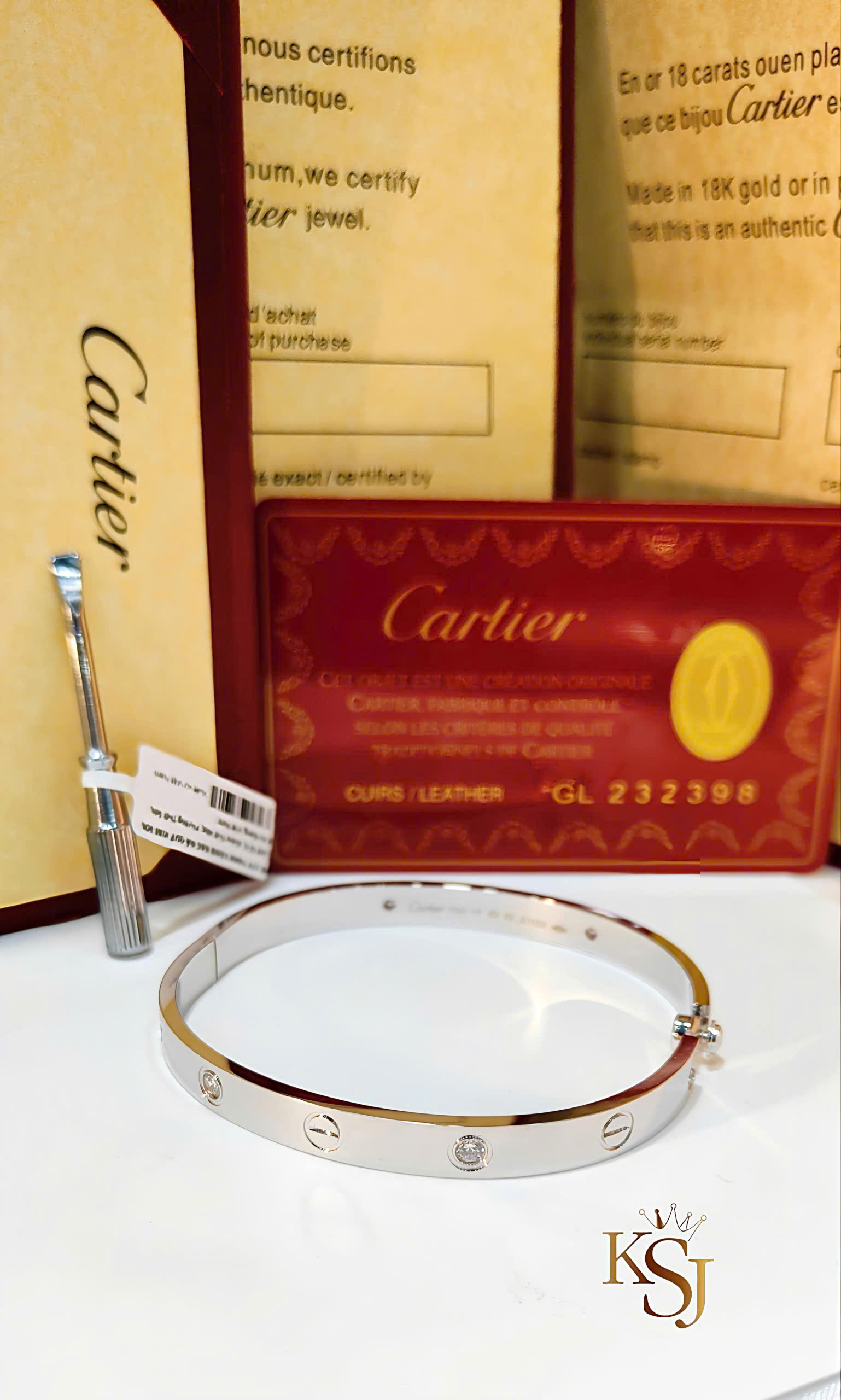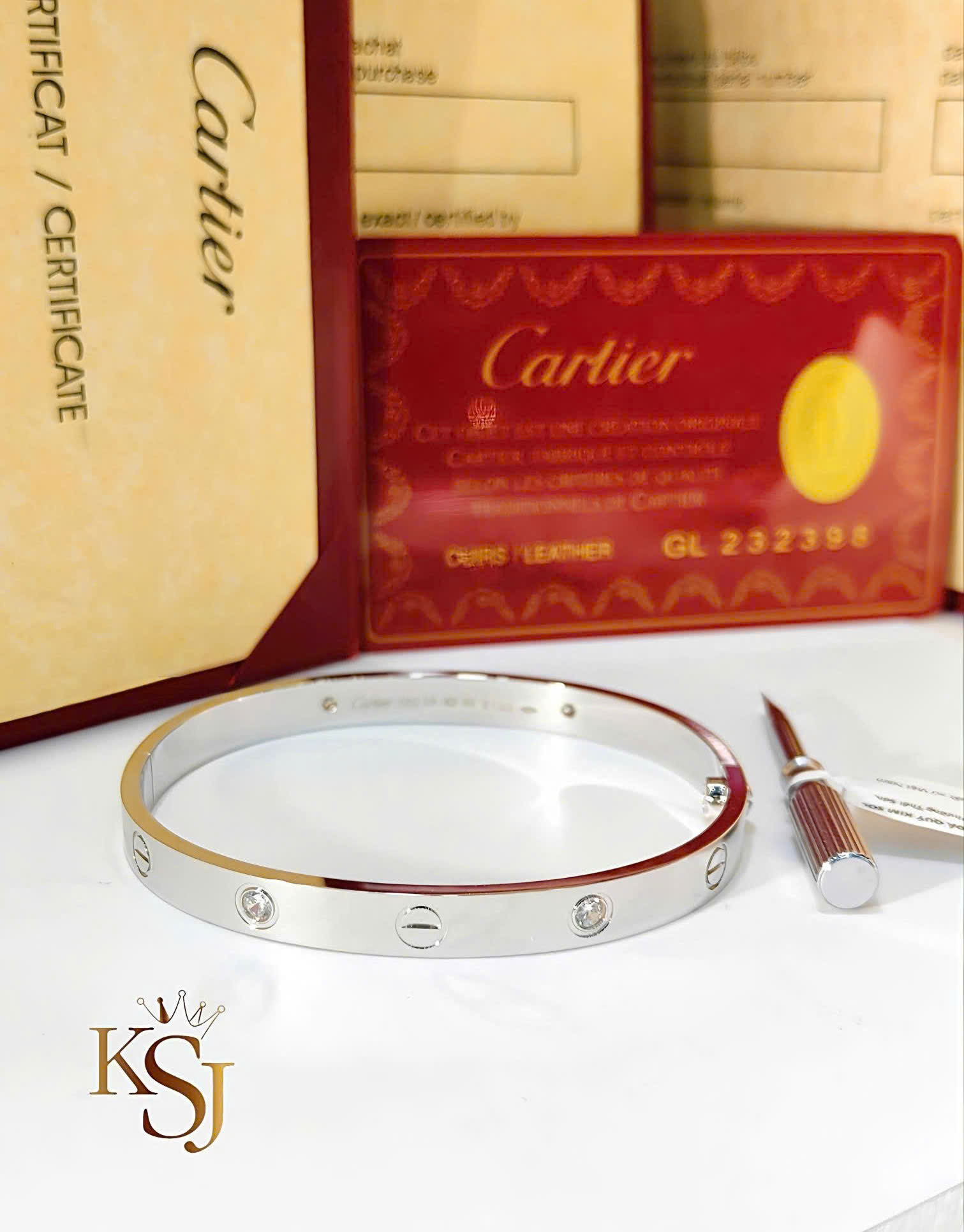 Thiết kế: Vòng tay có dạng hình bầu oval ôm sát cổ tay. Điểm đặc biệt của dòng Love Bracelet là hệ thống khóa bằng hai ốc vít thật ở hai bên, thường cần một chiếc tuốc nơ vít nhỏ đi kèm để mở hoặc đóng vòng.