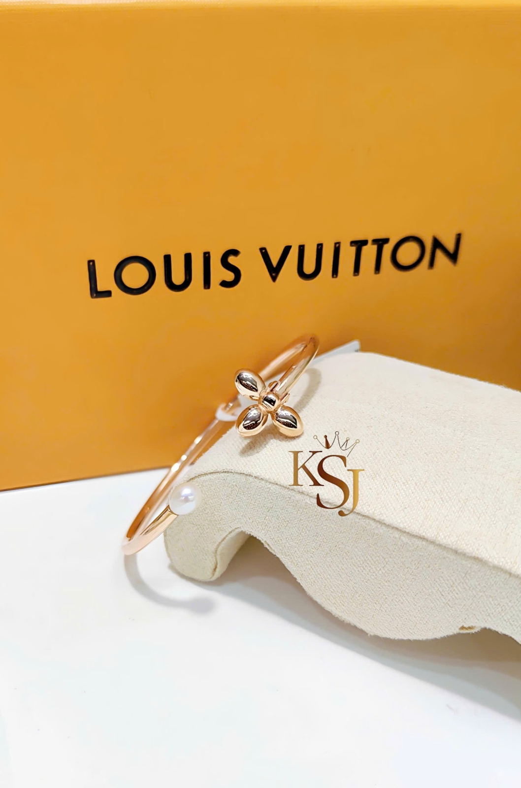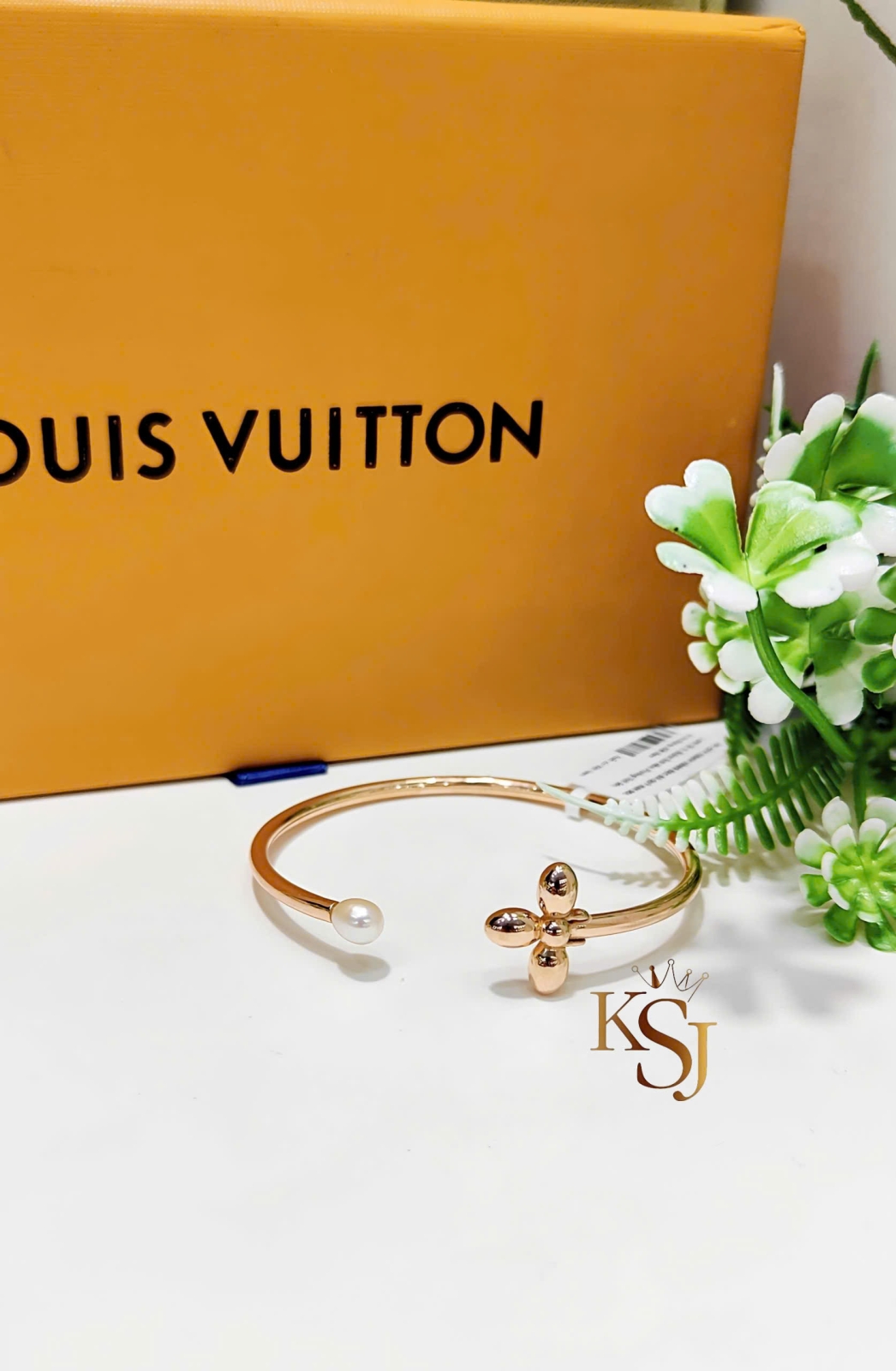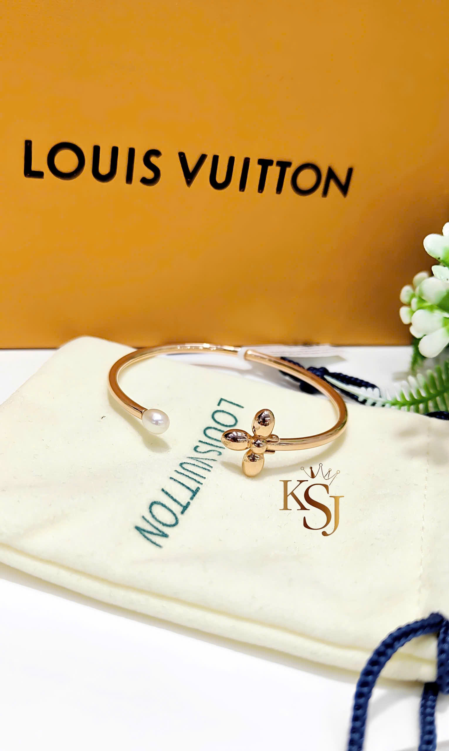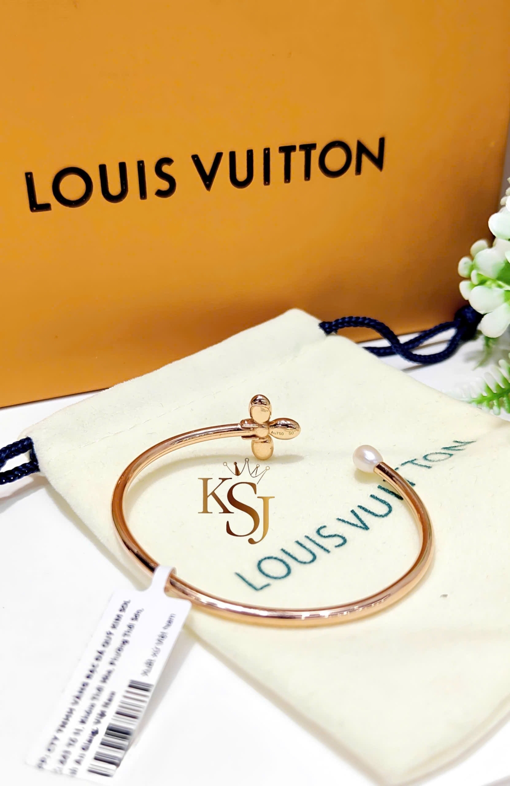Họa tiết: Hai đầu vòng được trang trí bằng một bông hoa bốn cánh (biểu tượng đặc trưng của LV) và một viên ngọc trai.