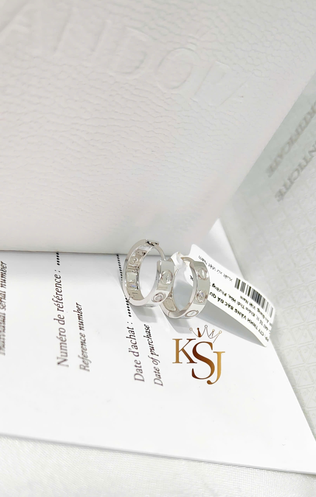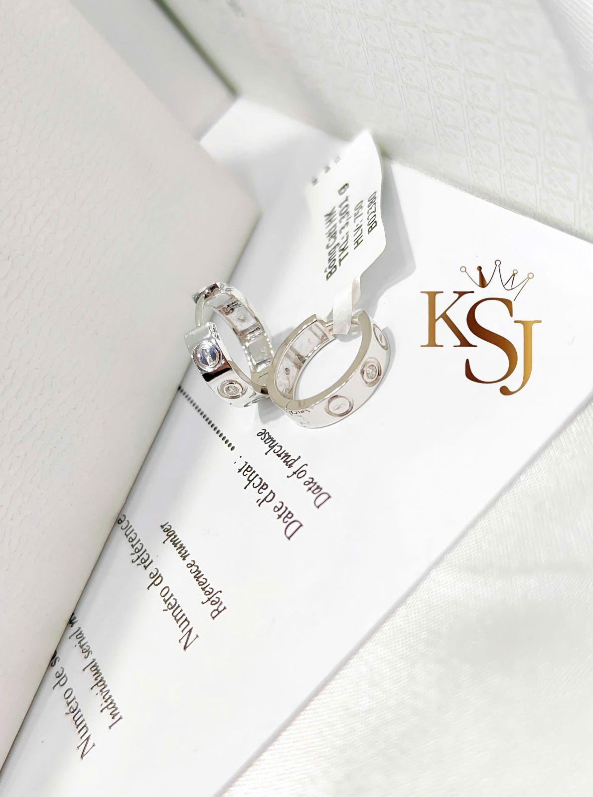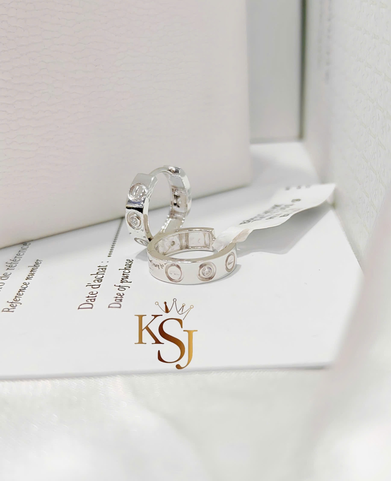 Bông tai dáng khoen (hoop earrings) có thiết kế lấy cảm hứng từ bộ sưu tập Love nổi tiếng của thương hiệu cao cấp Cartier. Các đặc điểm nhận diện chính bao gồm họa tiết đinh vít đặc trưng xen kẽ với các viên đá CZ (Cubic Zirconia)