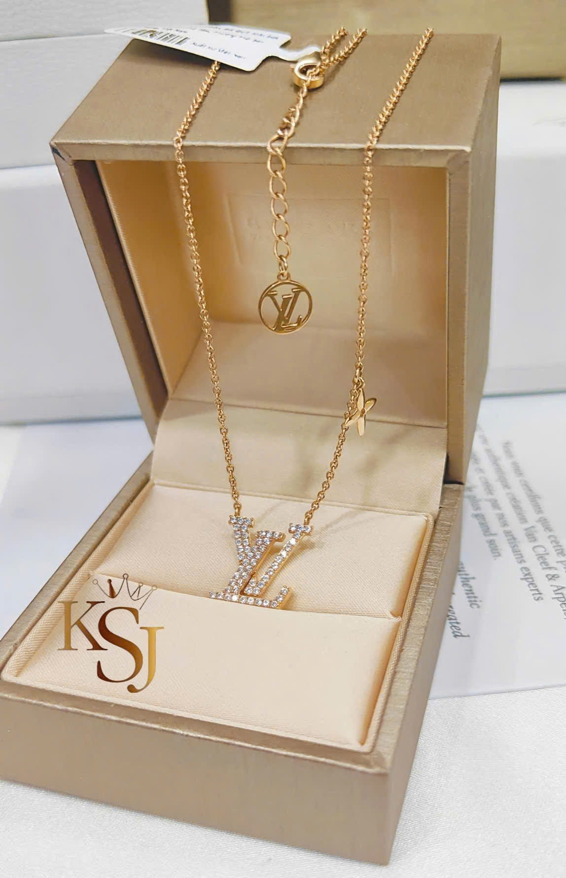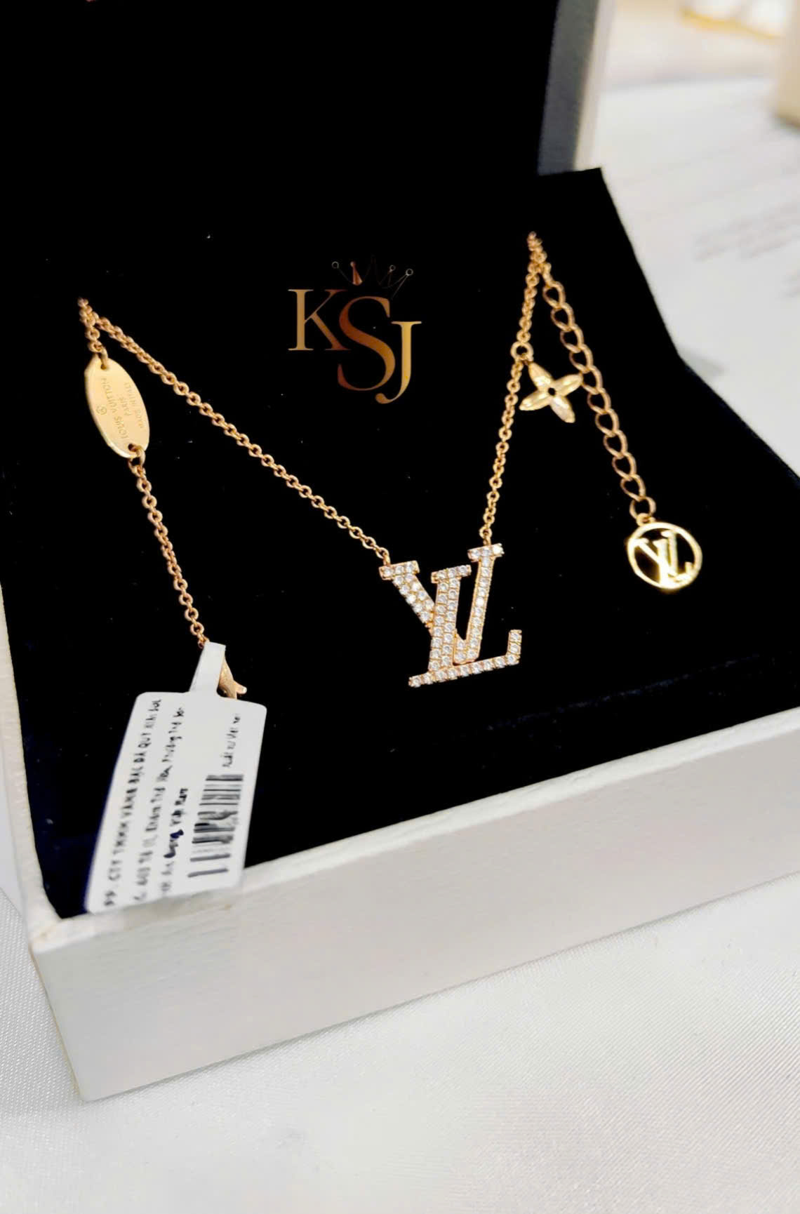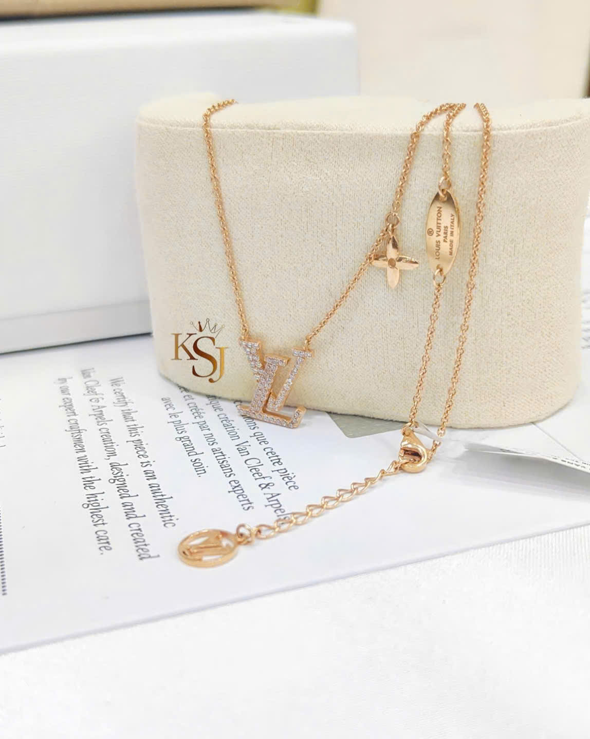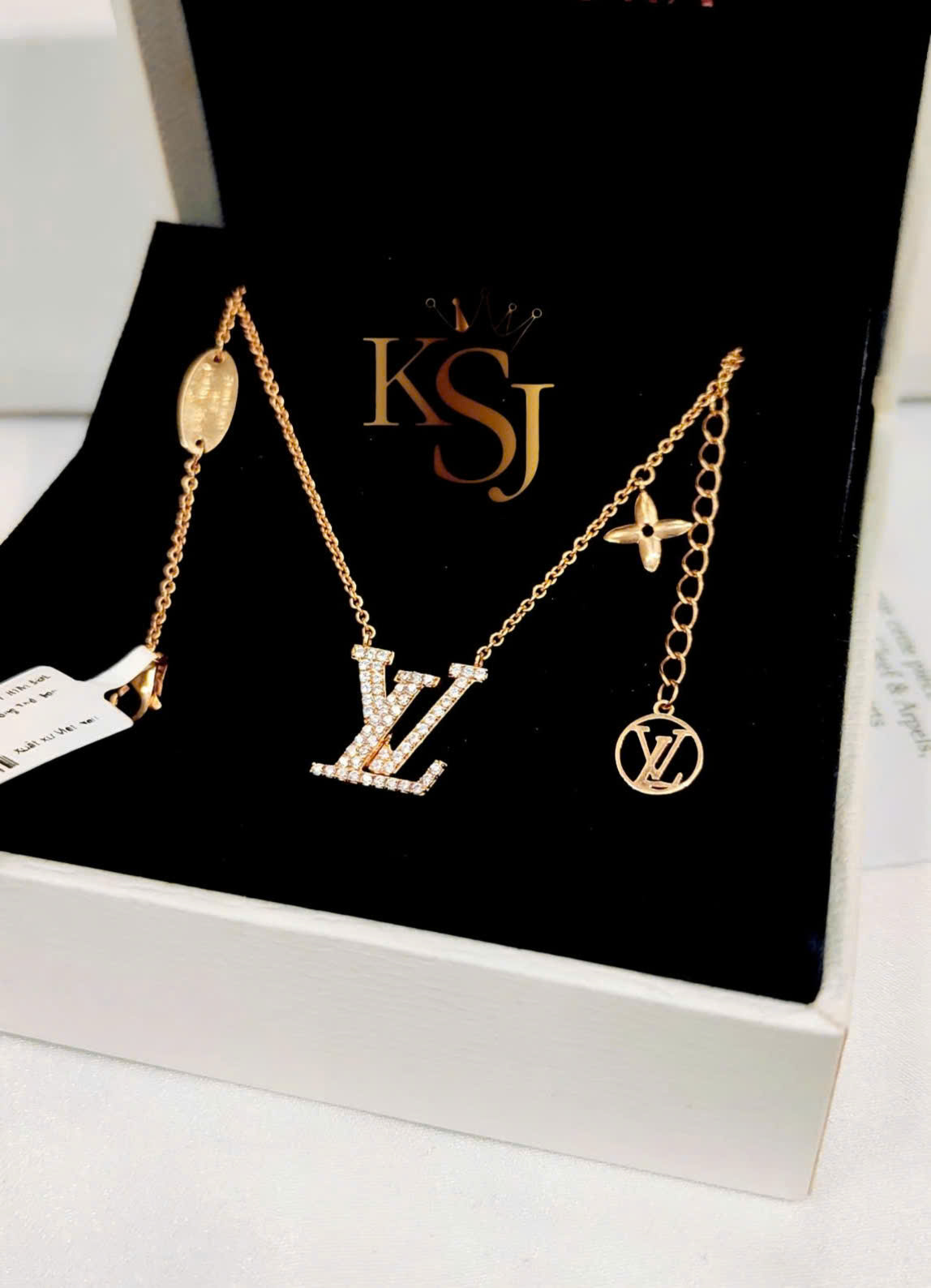 Mặt dây chuyền: Nổi bật với chữ lồng LV mang tính biểu tượng, được nạm những viên đá CZ lấp lánh.