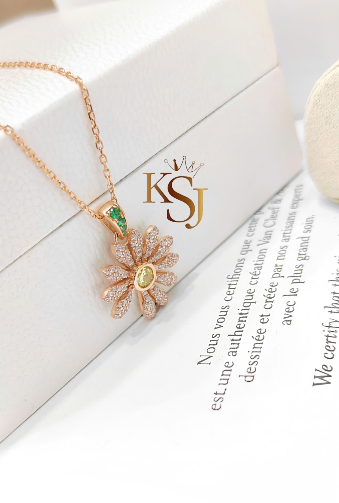Chất liệu: Dây chuyền được chế tác từ vàng hồng 750 (18K) và đính đá CZ trên các cánh hoa.