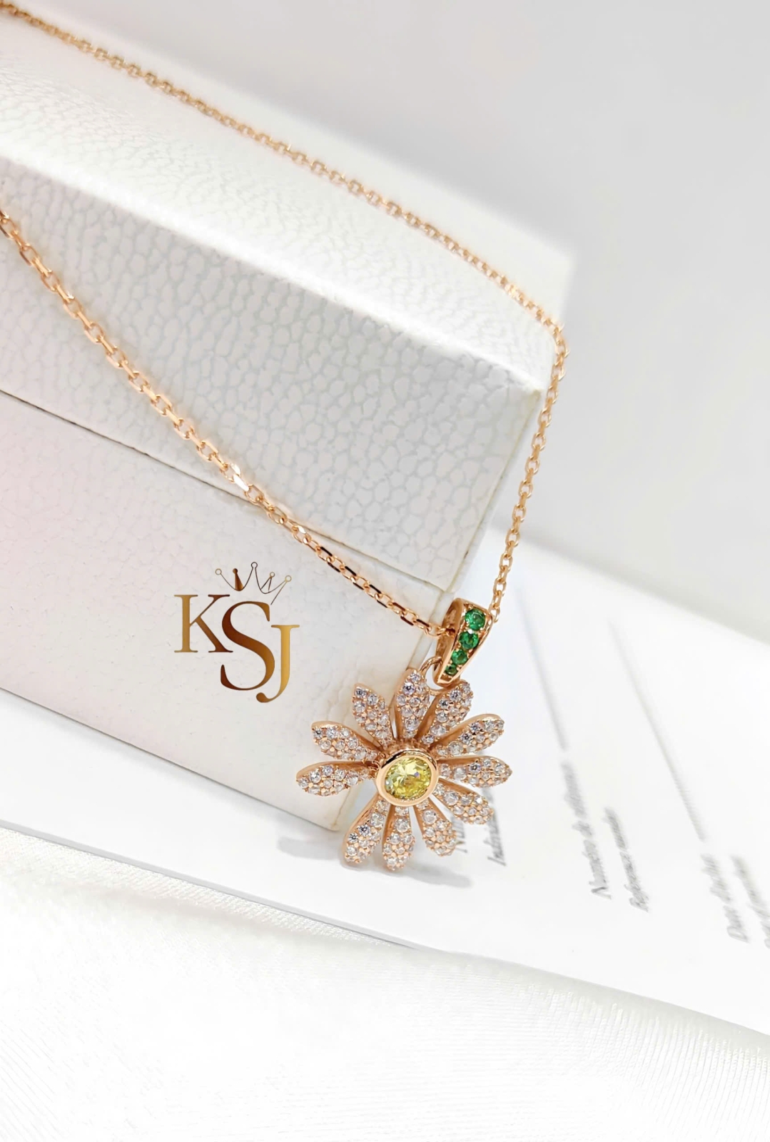 Điểm nhấn: Nhụy hoa là một viên CZ vàng, và phần móc treo (bail) được nạm đá CZ xanh.