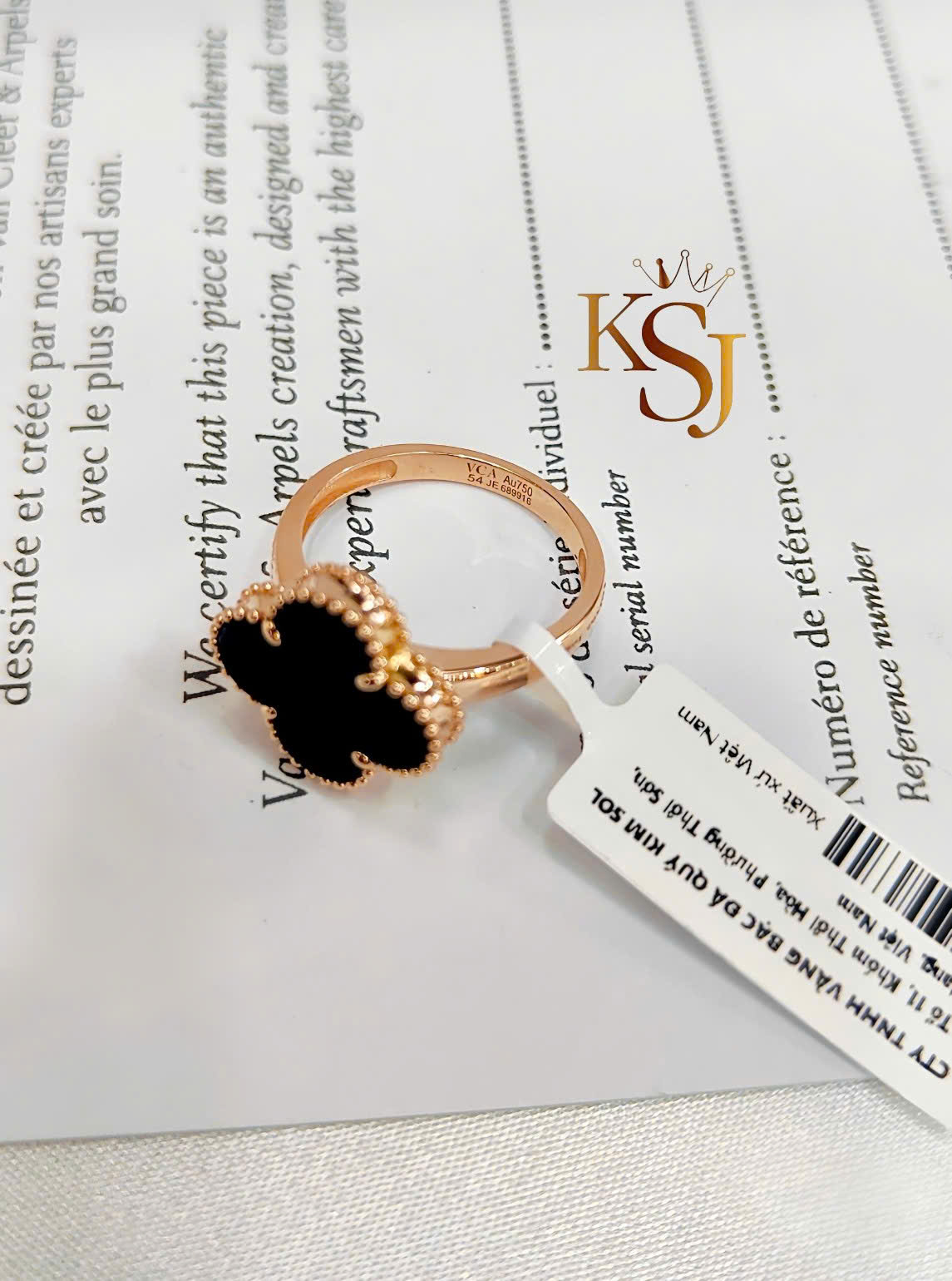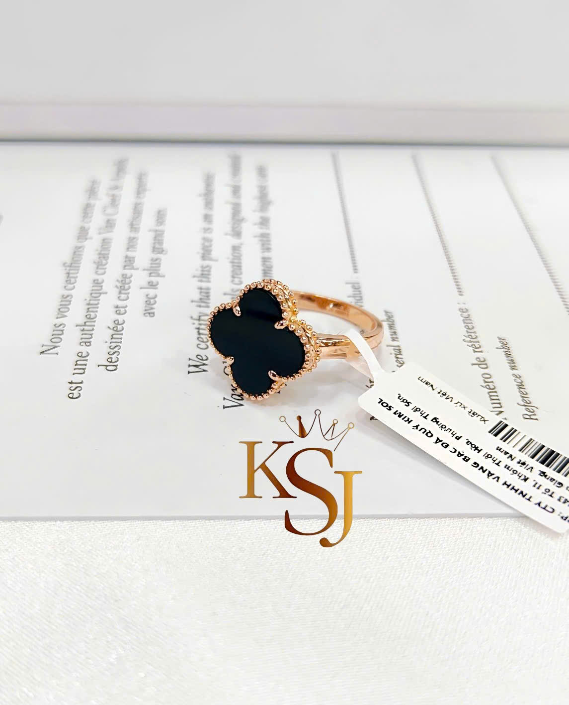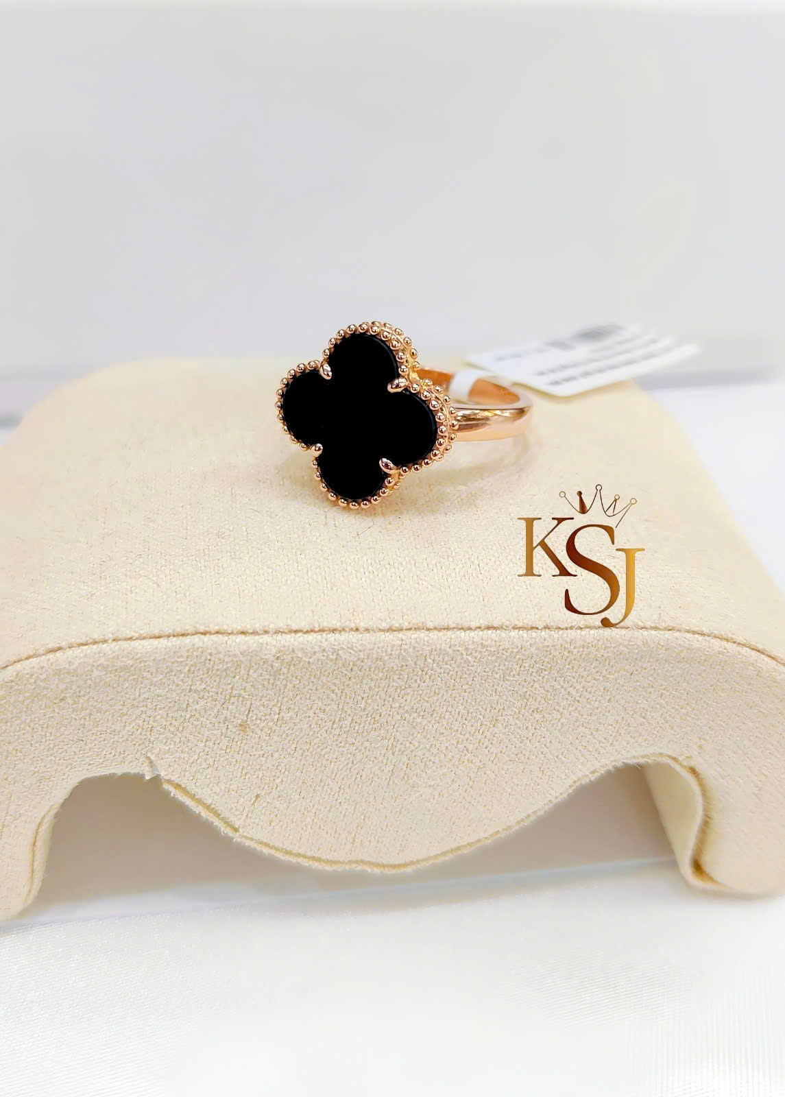 Mặt nhẫn: Hình cỏ bốn lá (biểu tượng của sự may mắn) được khảm đá Mã não đen (Onyx).