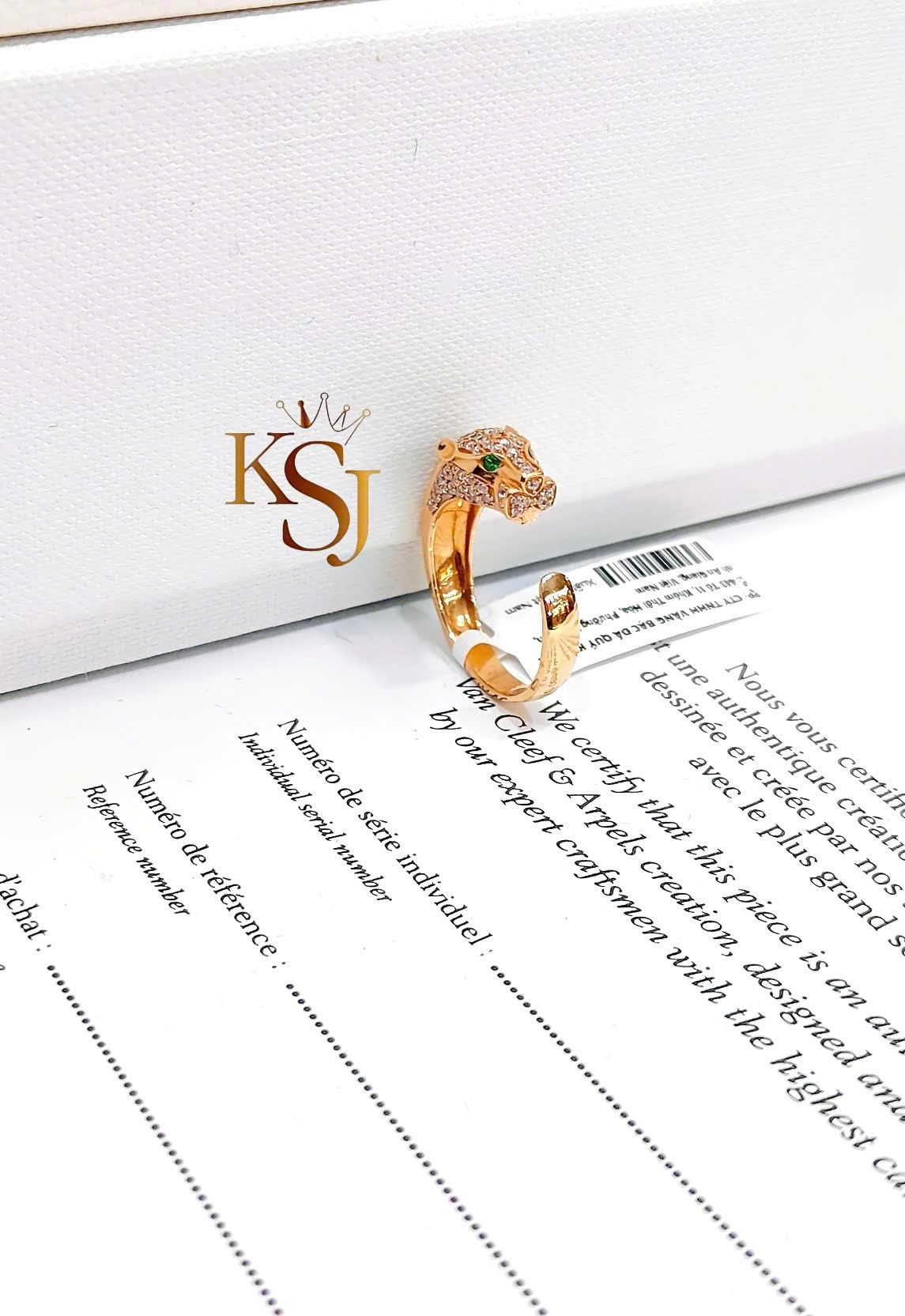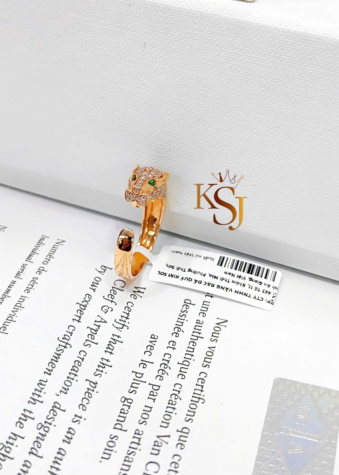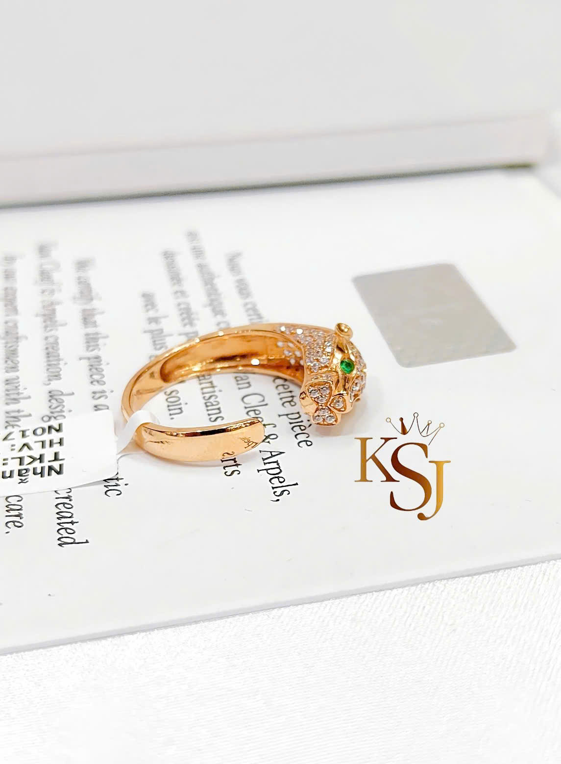 Thiết kế: Chiếc nhẫn có hình dáng một con báo quấn quanh ngón tay, với các chi tiết đính đá CZ toàn thân báo. Điểm nhấn quan trọng là đôi mắt xanh