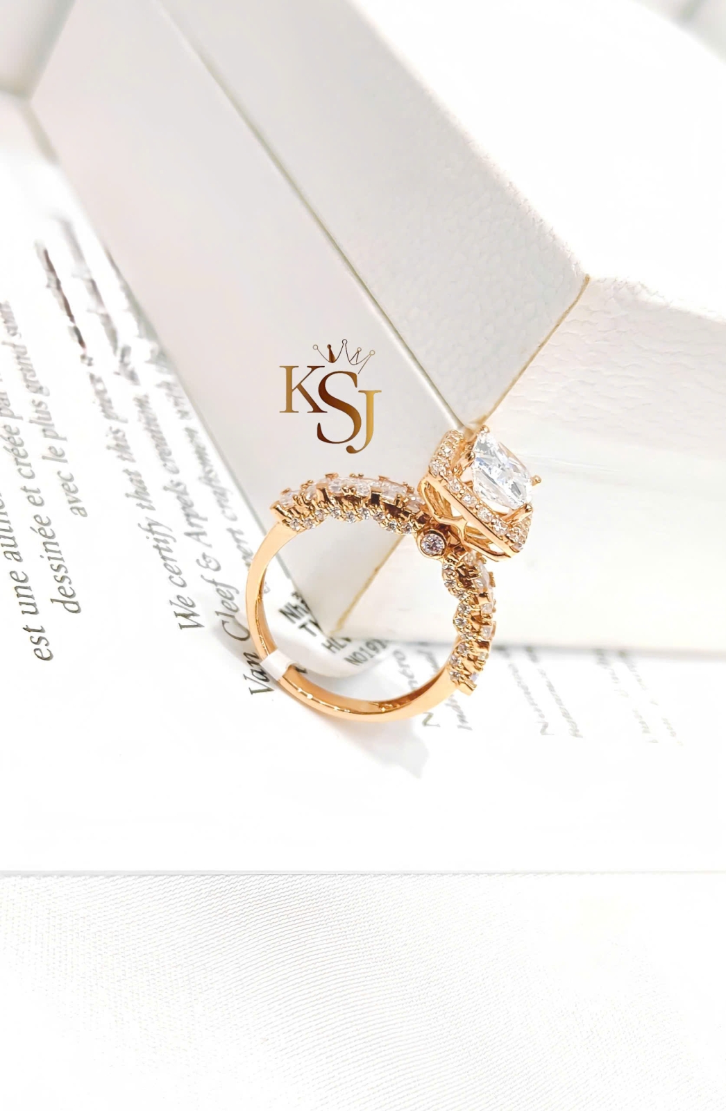 Mẫu nhẫn có thiết kế sang trọng với viên đá chủ lớn, được bao quanh bởi một vòng đá nhỏ (halo) và phần đai nhẫn đính đá tỉ mỉ trên chất liệu vàng hồng