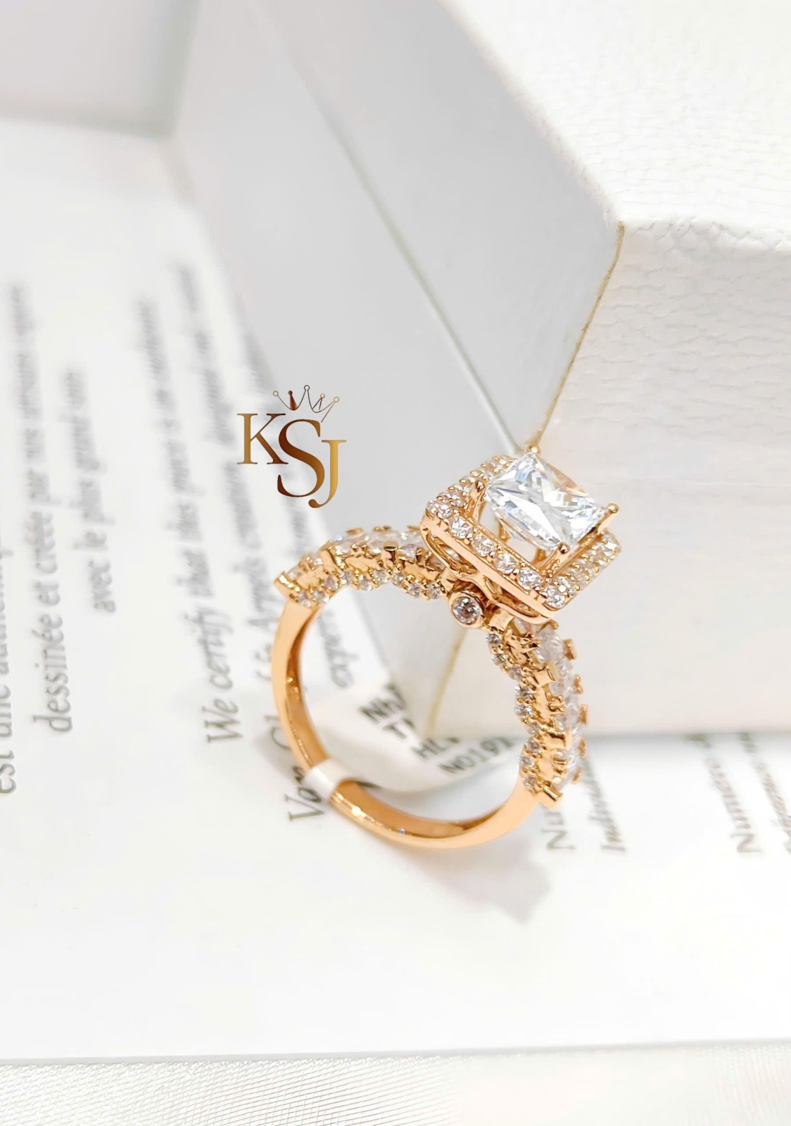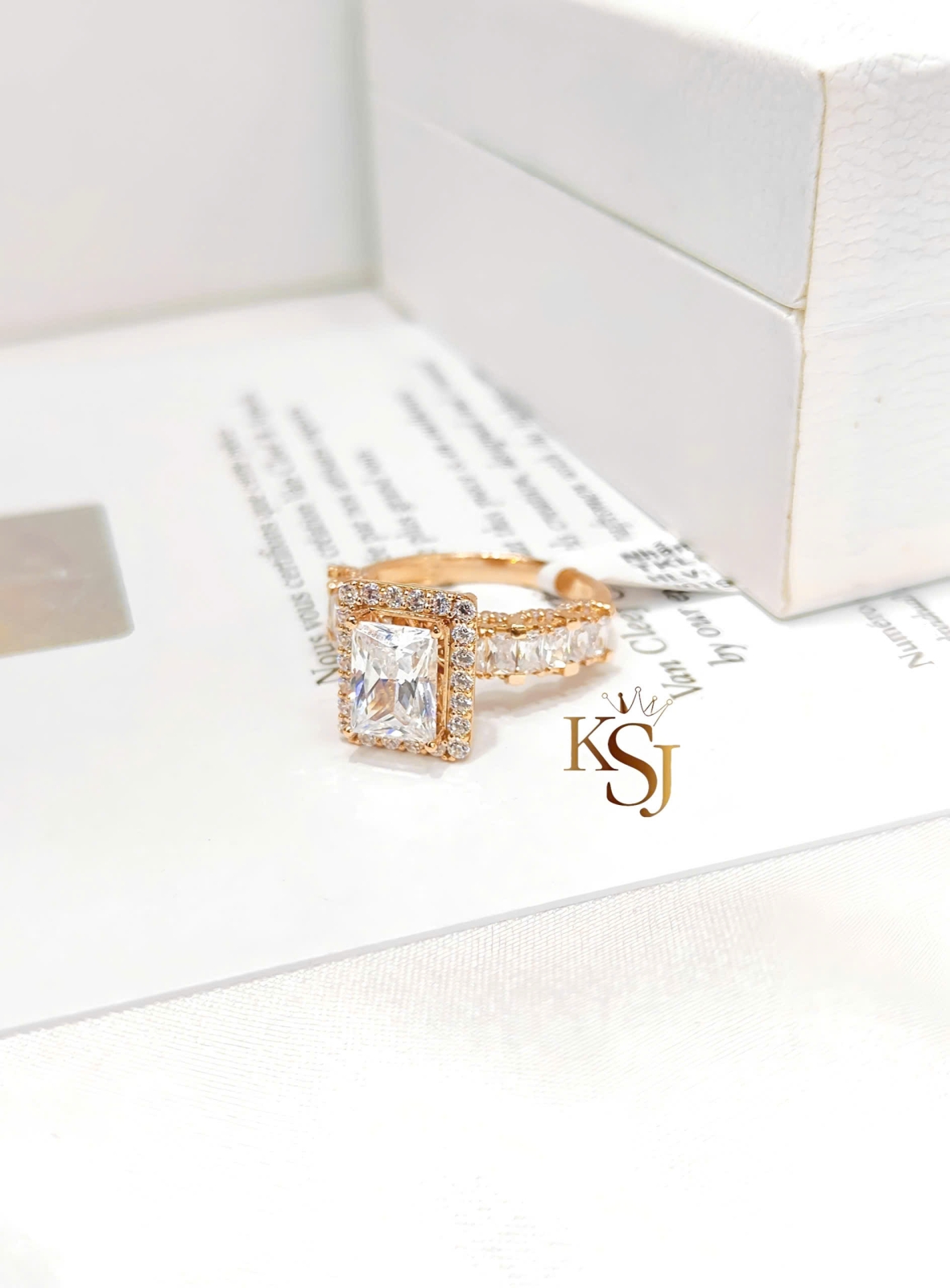 Thiết Kế: Viên chủ được đính đá CZ với giác cắt Emerald/Radiant thường có thiết kế đai nhẫn cầu kỳ để tôn vinh viên đá chủ. Kiểu dáng mặt đá chủ được bao quanh bởi các viên đá tấm (halo)