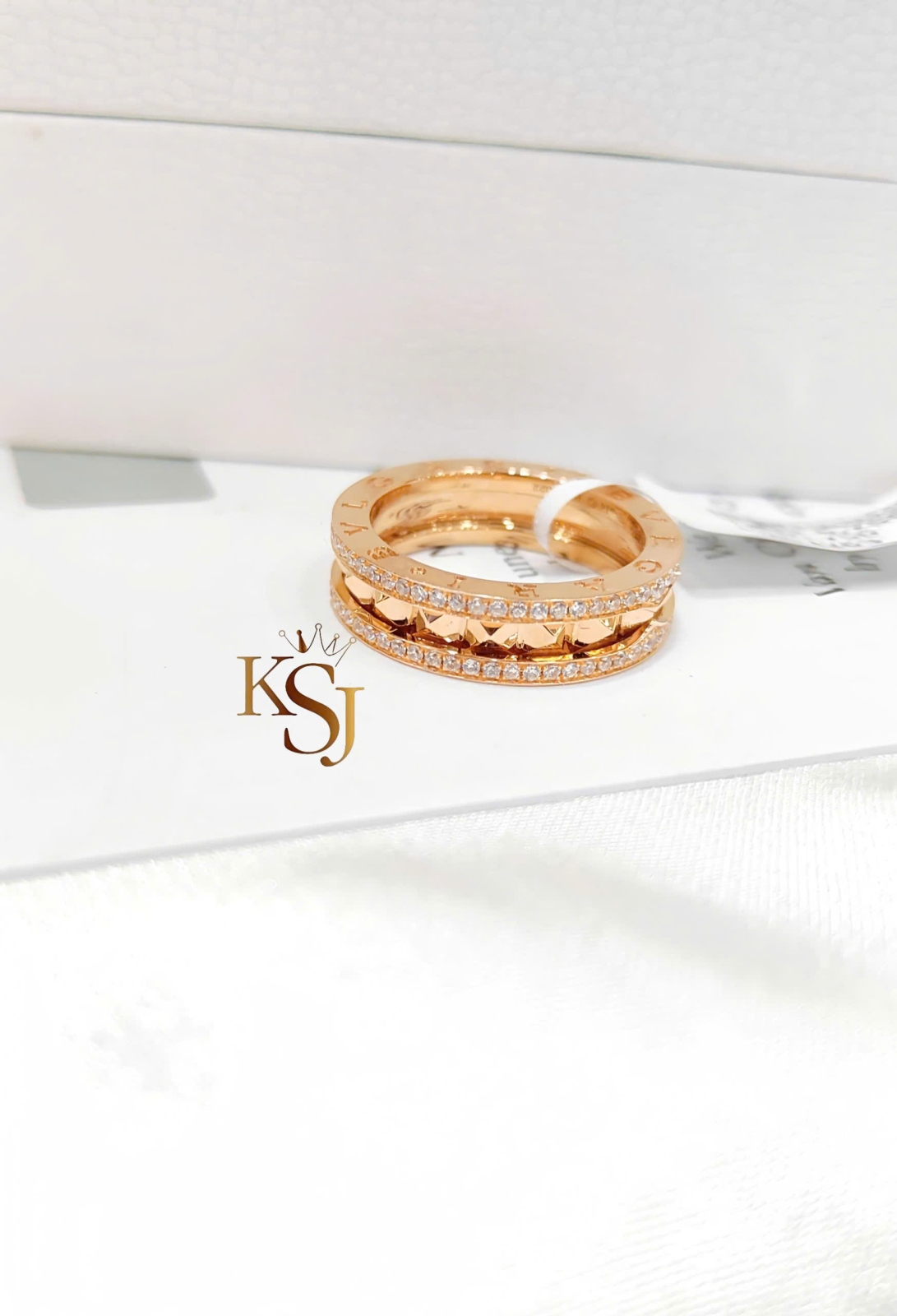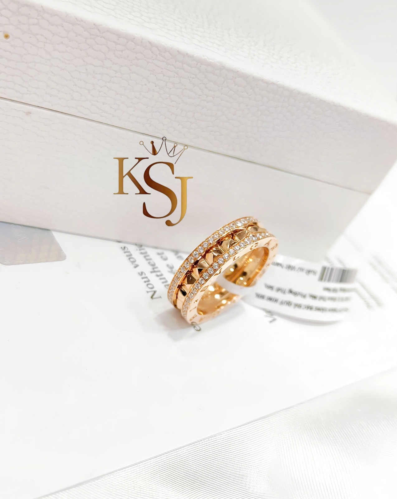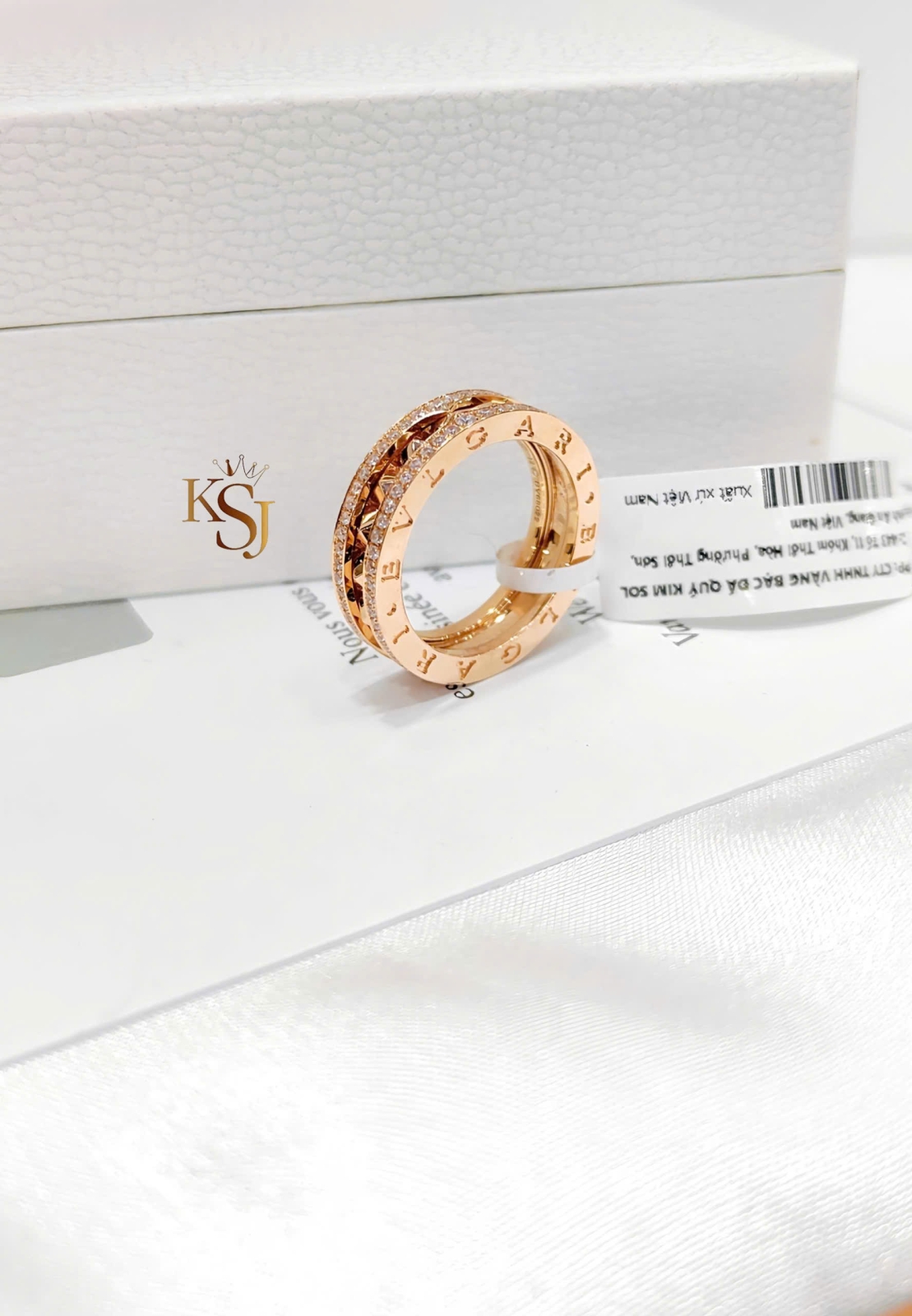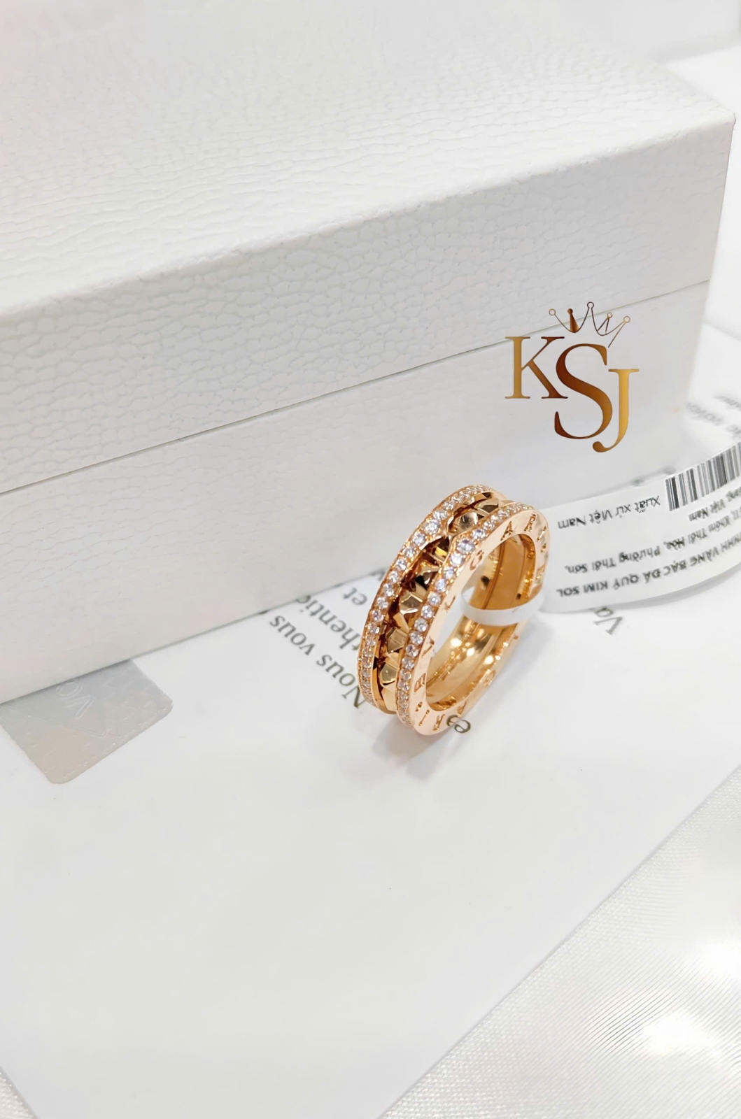 Chiếc nhẫn trong hình bạn gửi là mẫu Bvlgari B.zero1 Rock, một dòng sản phẩm nổi bật kết hợp giữa thiết kế xoắn ốc cổ điển của Bvlgari với các đinh tán (studs) cá tính.
