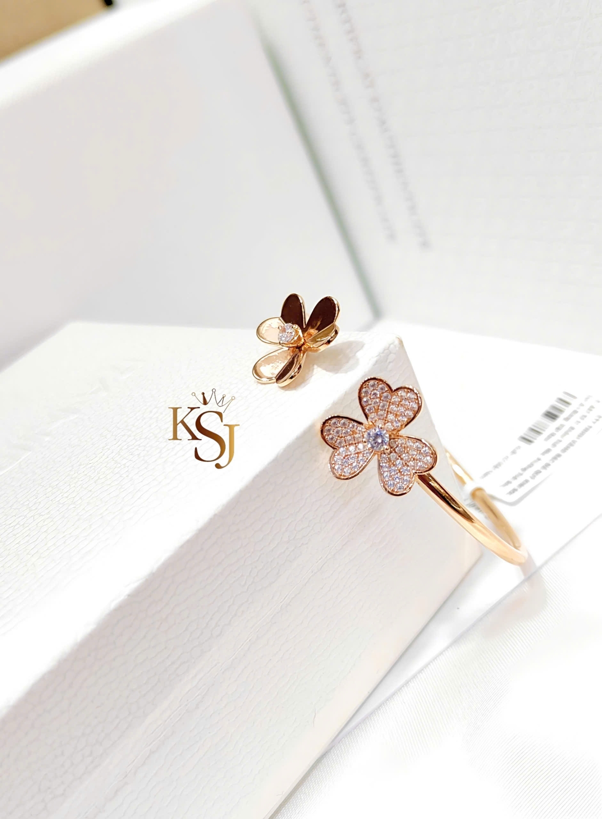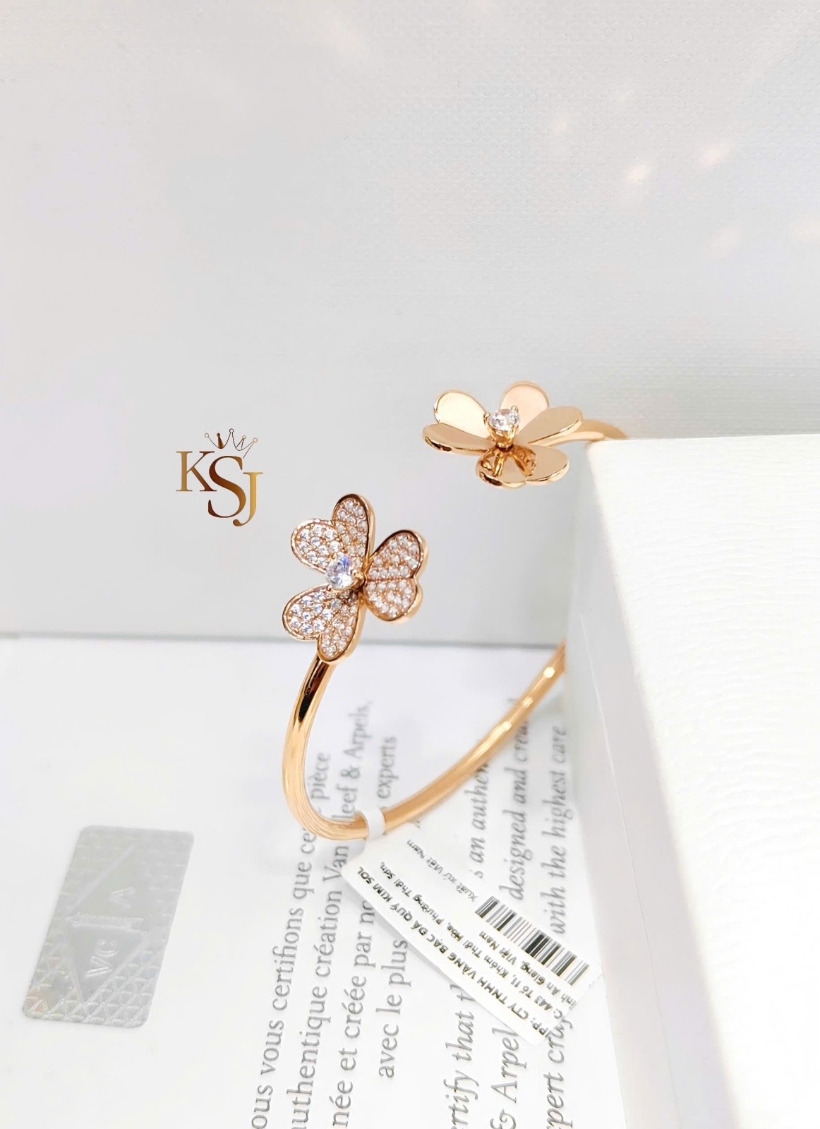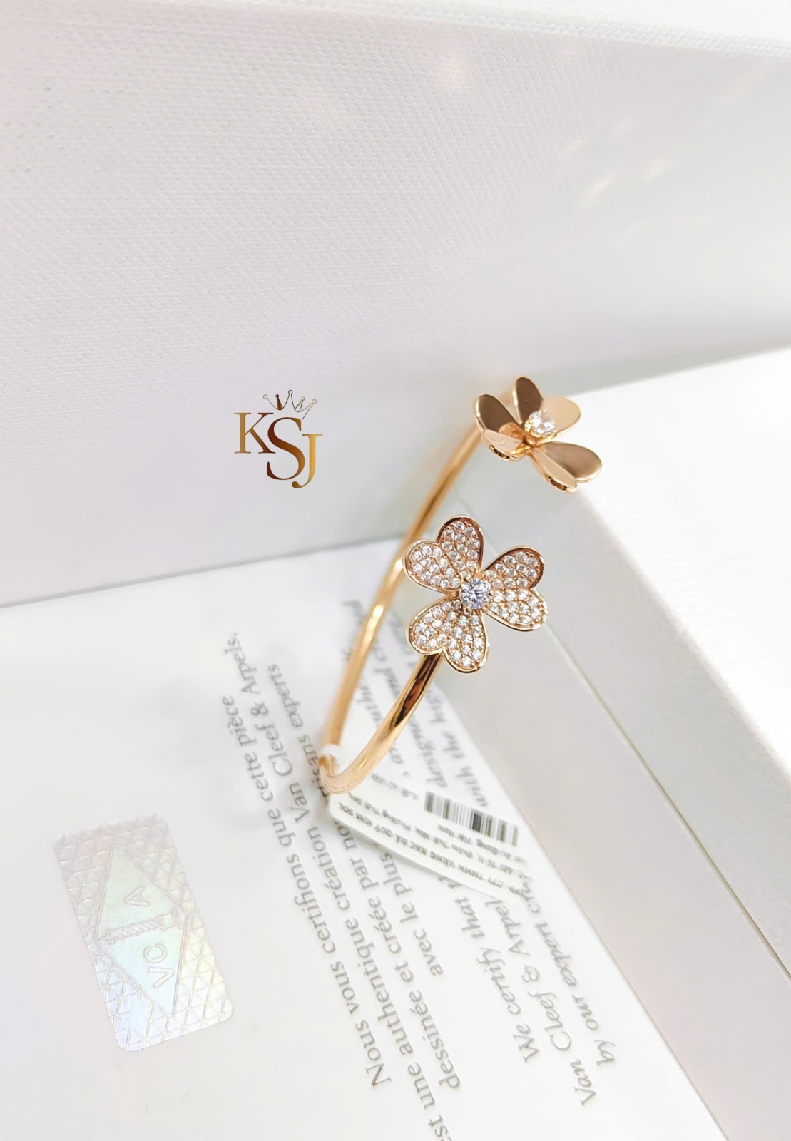 Chiếc vòng tay này có thiết kế dạng vòng hở (cuff) với hai đầu là họa tiết hoa được đính đá lấp lánh trên chất liệu vàng hồng. Được lấy cảm hứng từ thương hiệu trang sức cao cấp Van Cleef & Arpels
