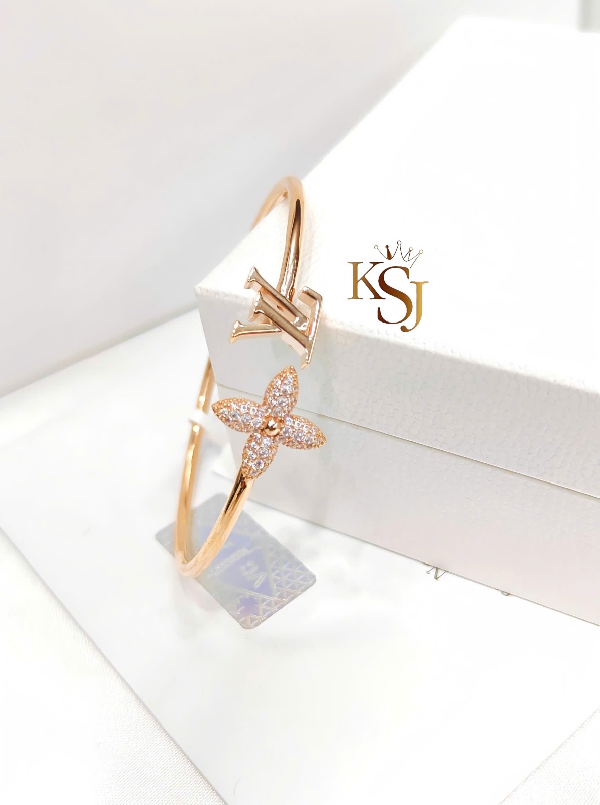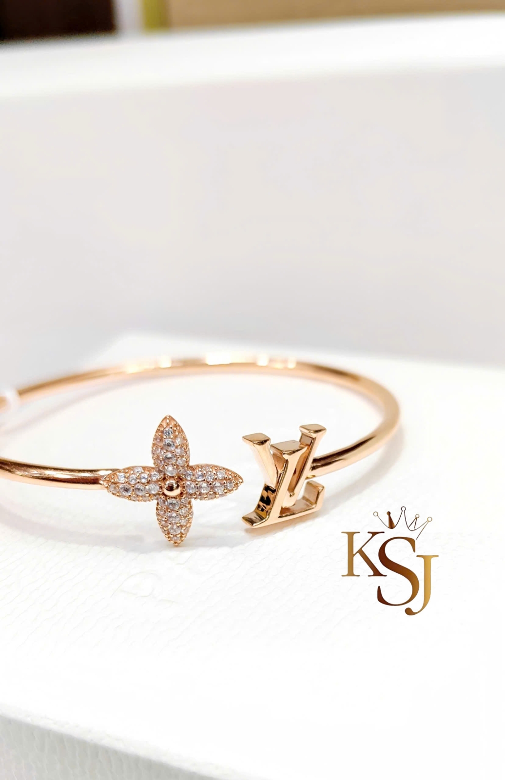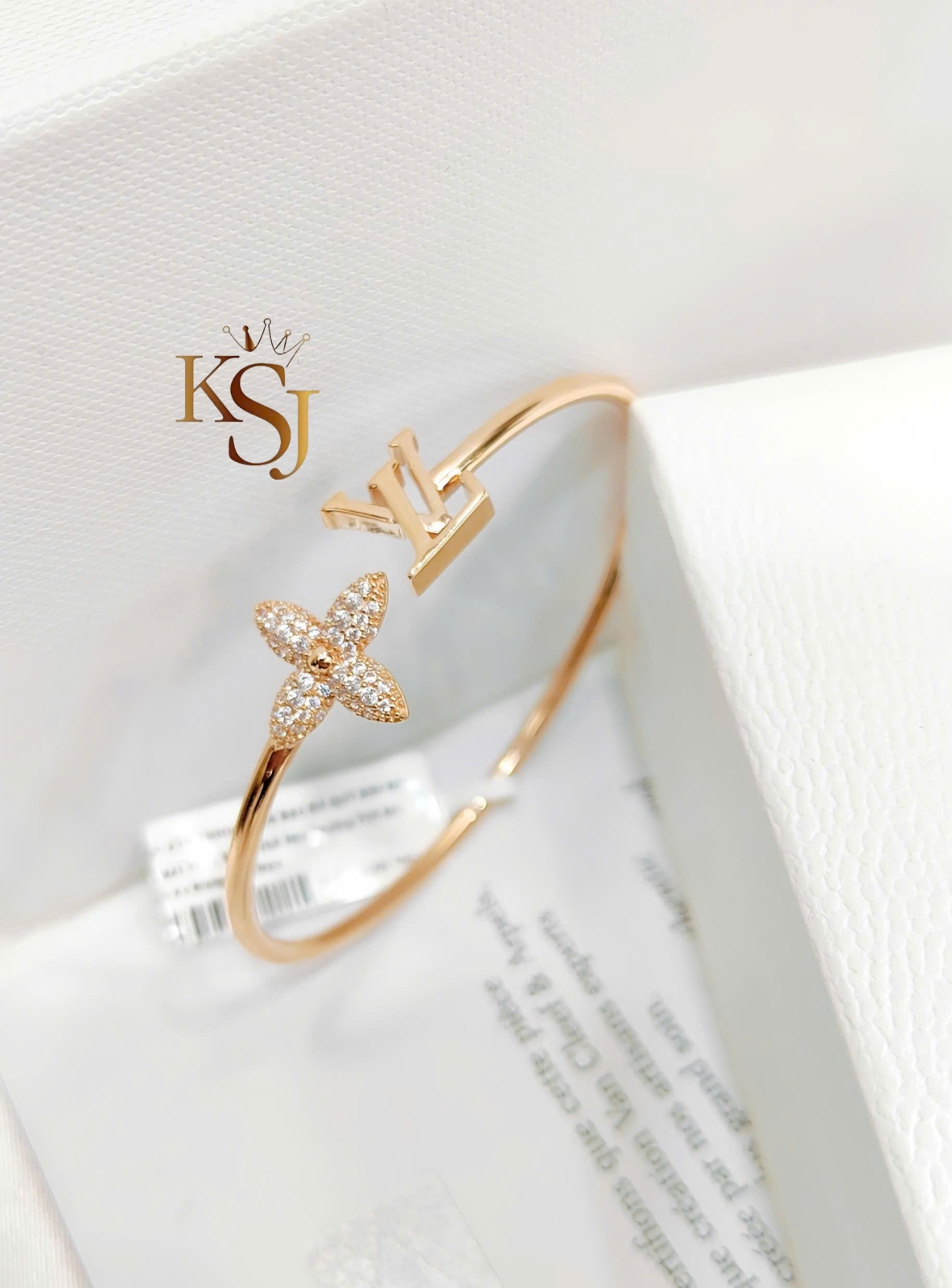 Đặc điểm: Một đầu vòng là chữ LV viết lồng, đầu còn lại là bông hoa 4 cánh nhọn được đính đá tỉ mỉ.